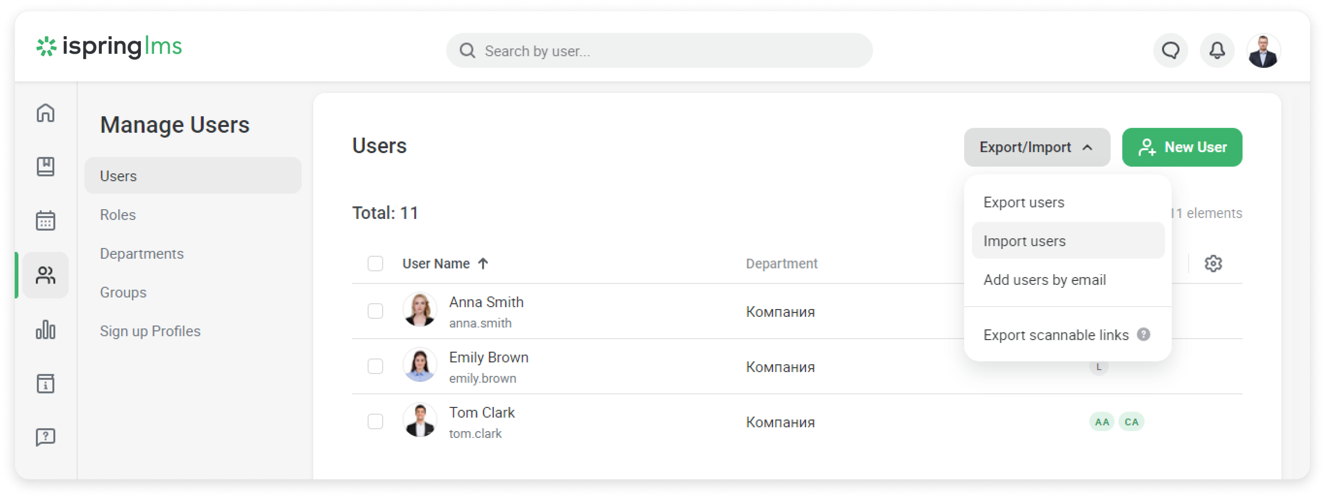 To save time, you can add a list of users from an Excel file. This option will come in handy if you want to bulk upload your user database exported from your accounting system or when you need to transfer many users to another group or department.