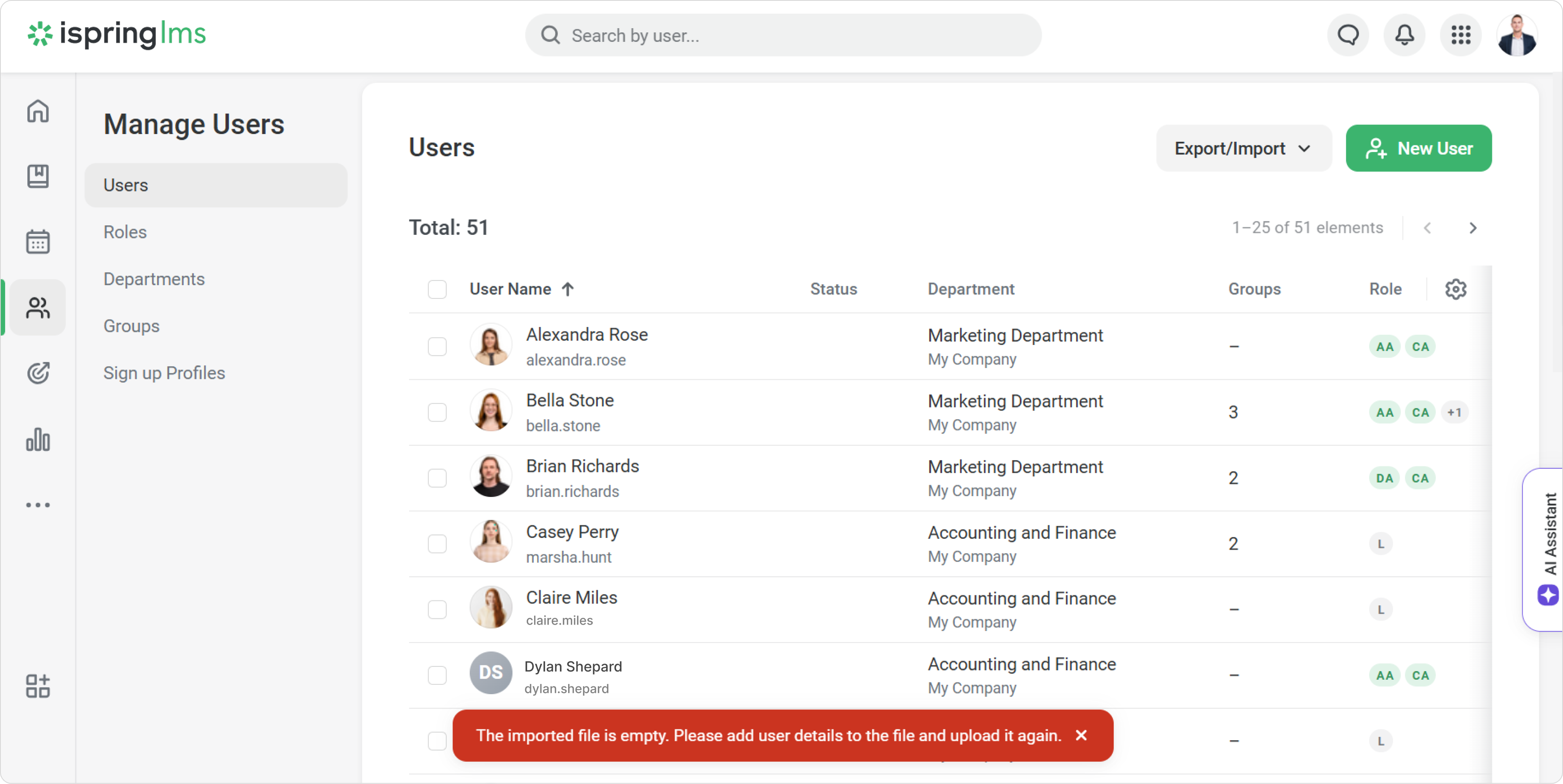 Make sure every cell in the Login column is filled in — if even one is empty, the entire import file will be treated as empty.