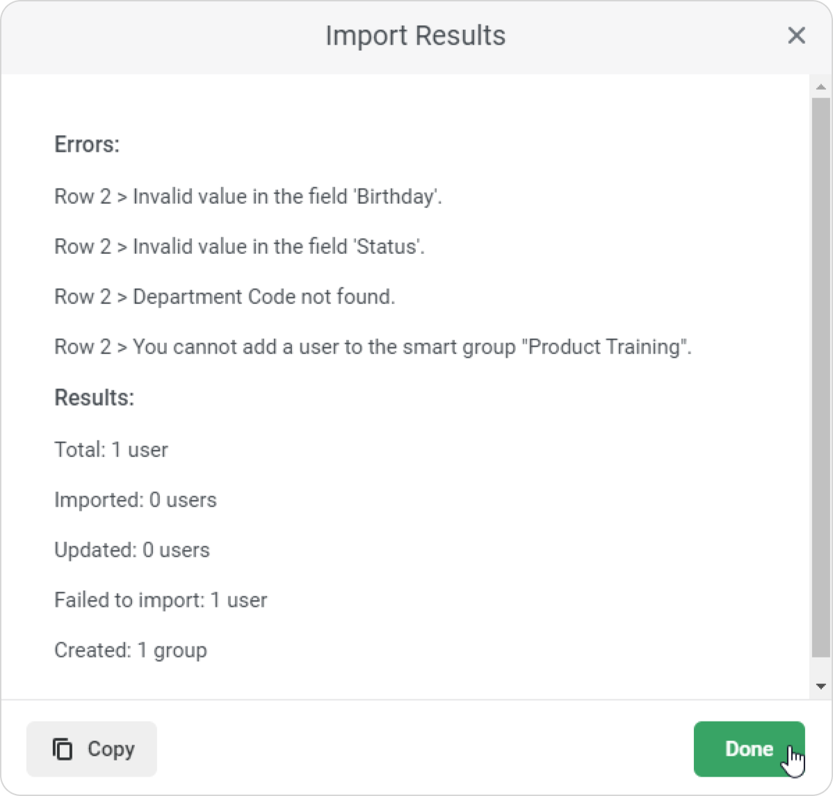 - After the importing process is complete, you will see a pop-up window announcing its results. Here you can copy results and possible errors. Click Done to go to the user list.