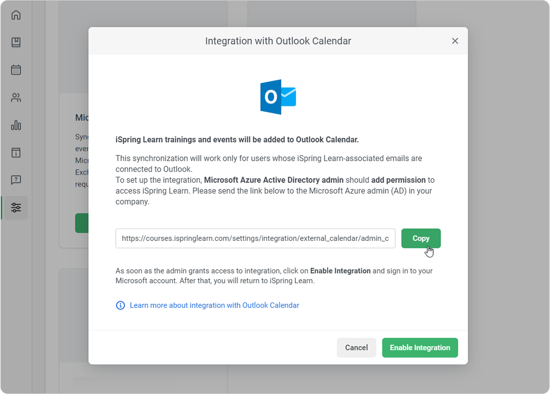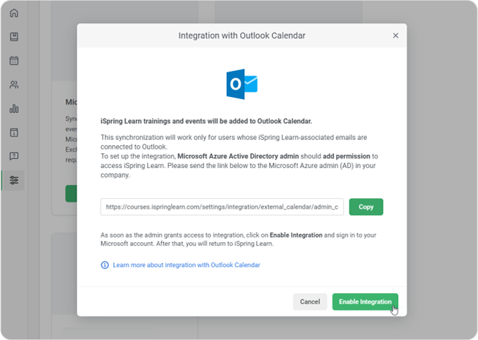 - Only the Account Owner and Account Administrator can enable the Outlook integration in the iSpring LMS account.