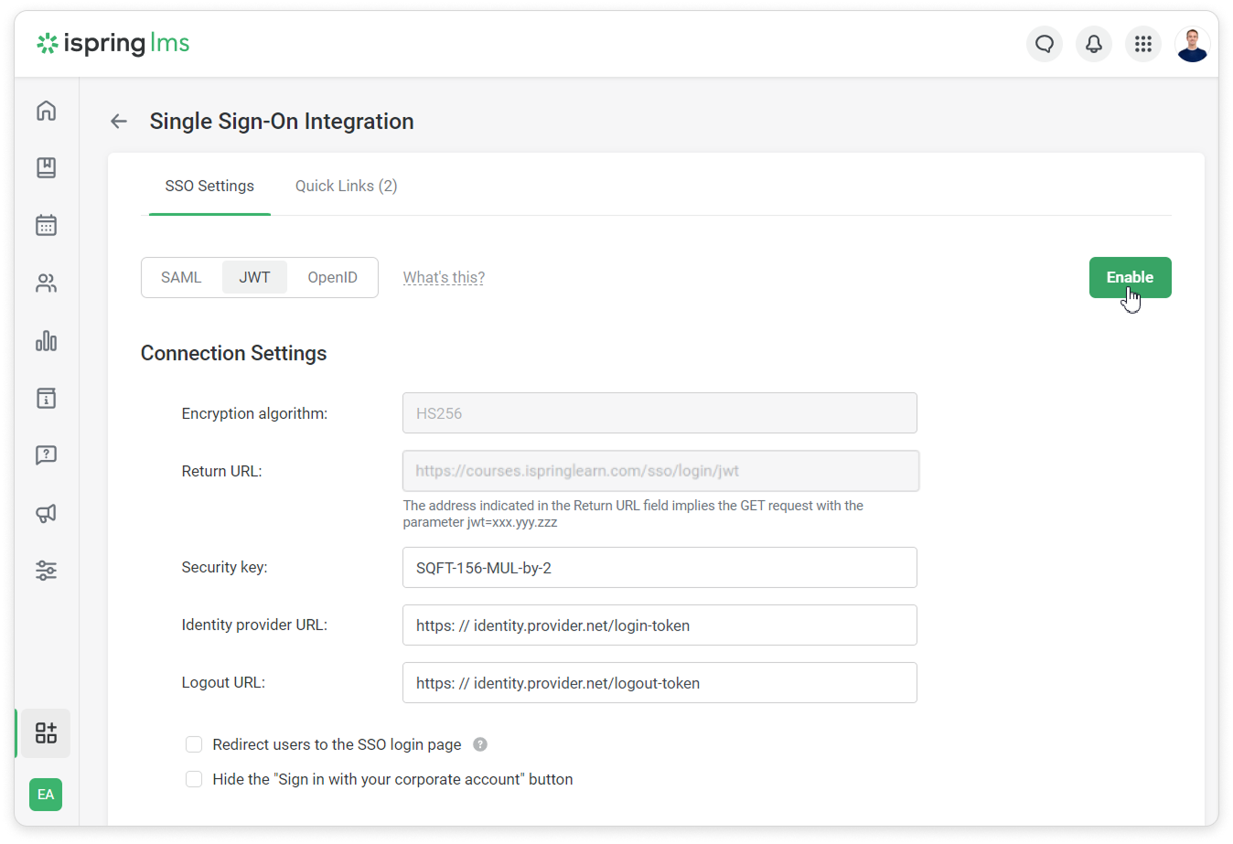 - Log in to your iSpring LMS account. Then go to the SSO Settings and click JWT.