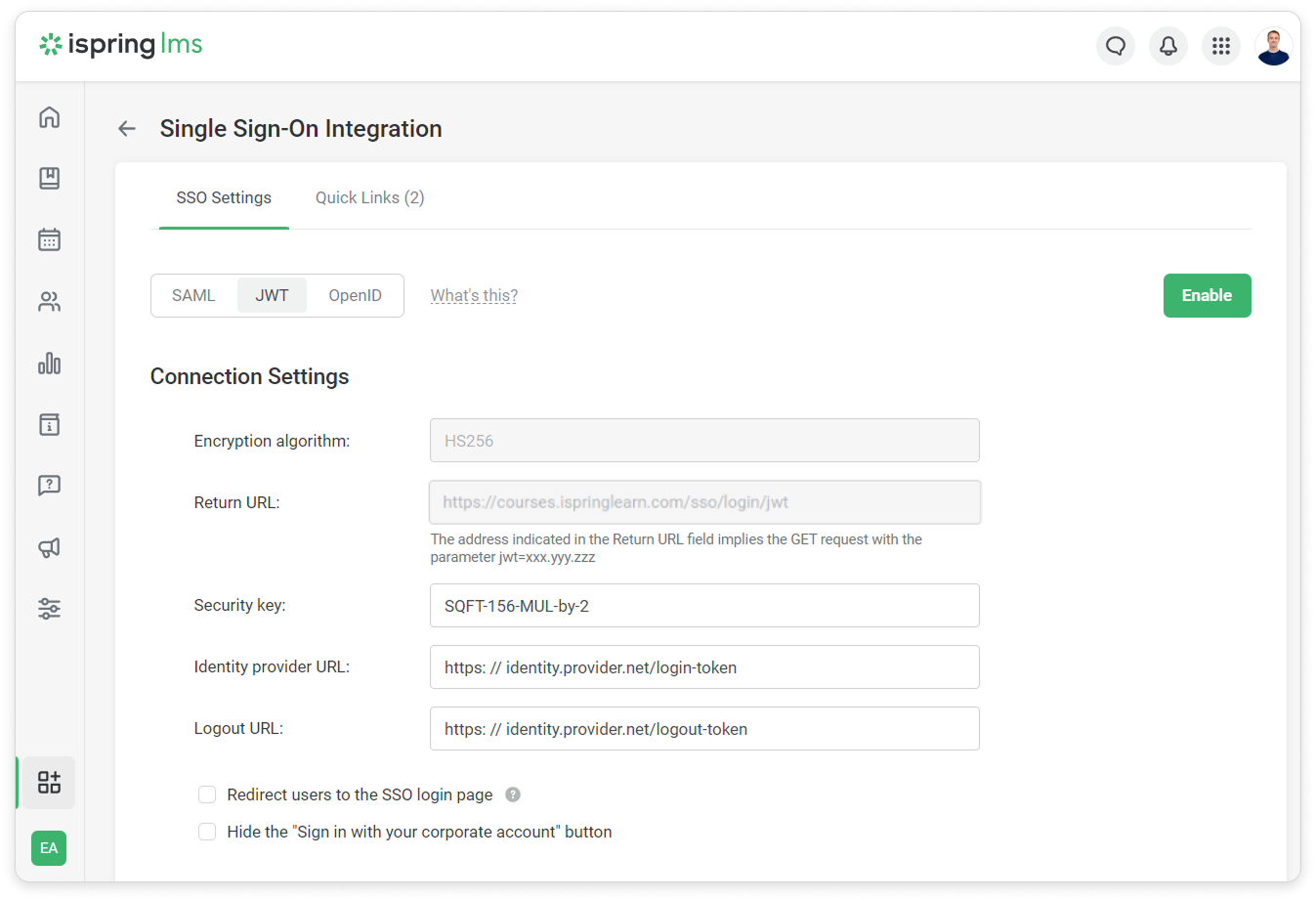 One of the ways to perform single sign-on in iSpring LMS is to use JSON Web Token (JWT). It is an open standard for passing claims between parties in a web application environment. It is used to encrypt and pass the identity of authenticated users between an your corporate website and iSpring LMS. In other words, it provides a fluent and secure login data transfer from your website to iSpring LMS.