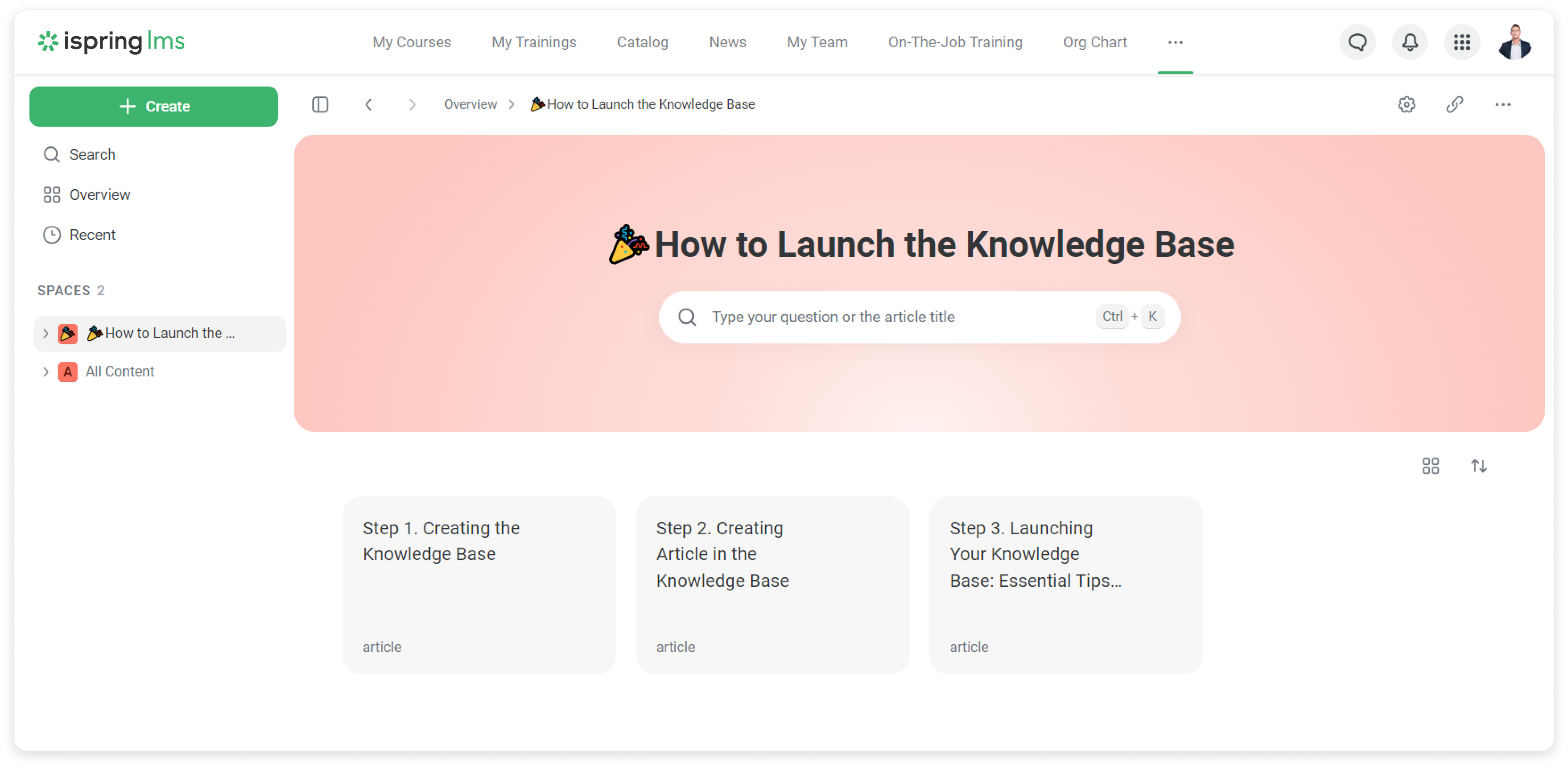 To get started, you can access the How to Launch the Knowledge Base space. Here, you can find articles on creating spaces, filling Knowledge Base with content, and getting employee buy-in regarding using Knowledge Base.