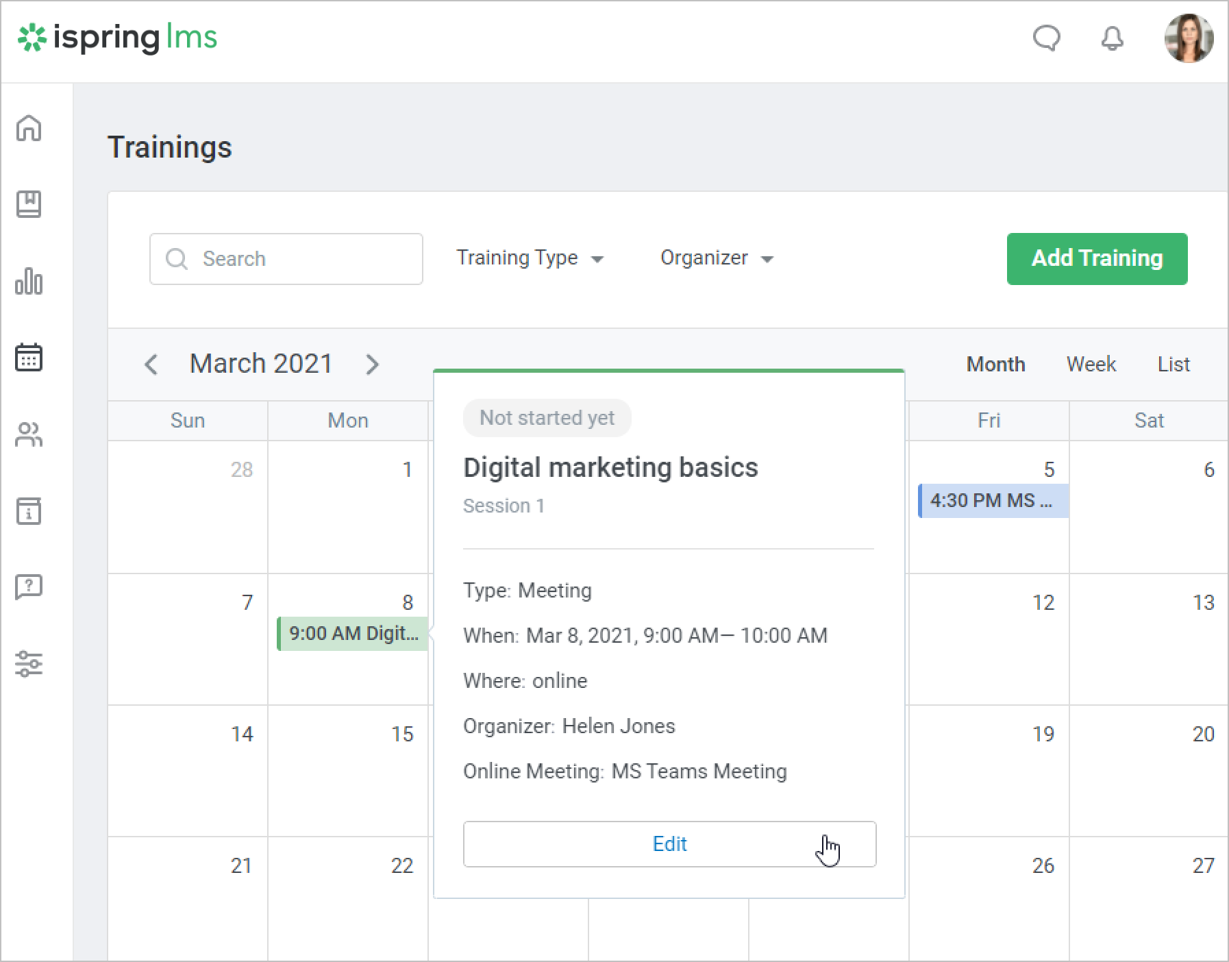 - Go to the Trainings section, locate the meeting in the calendar, click on it, and hit the Edit button in the appeared window.