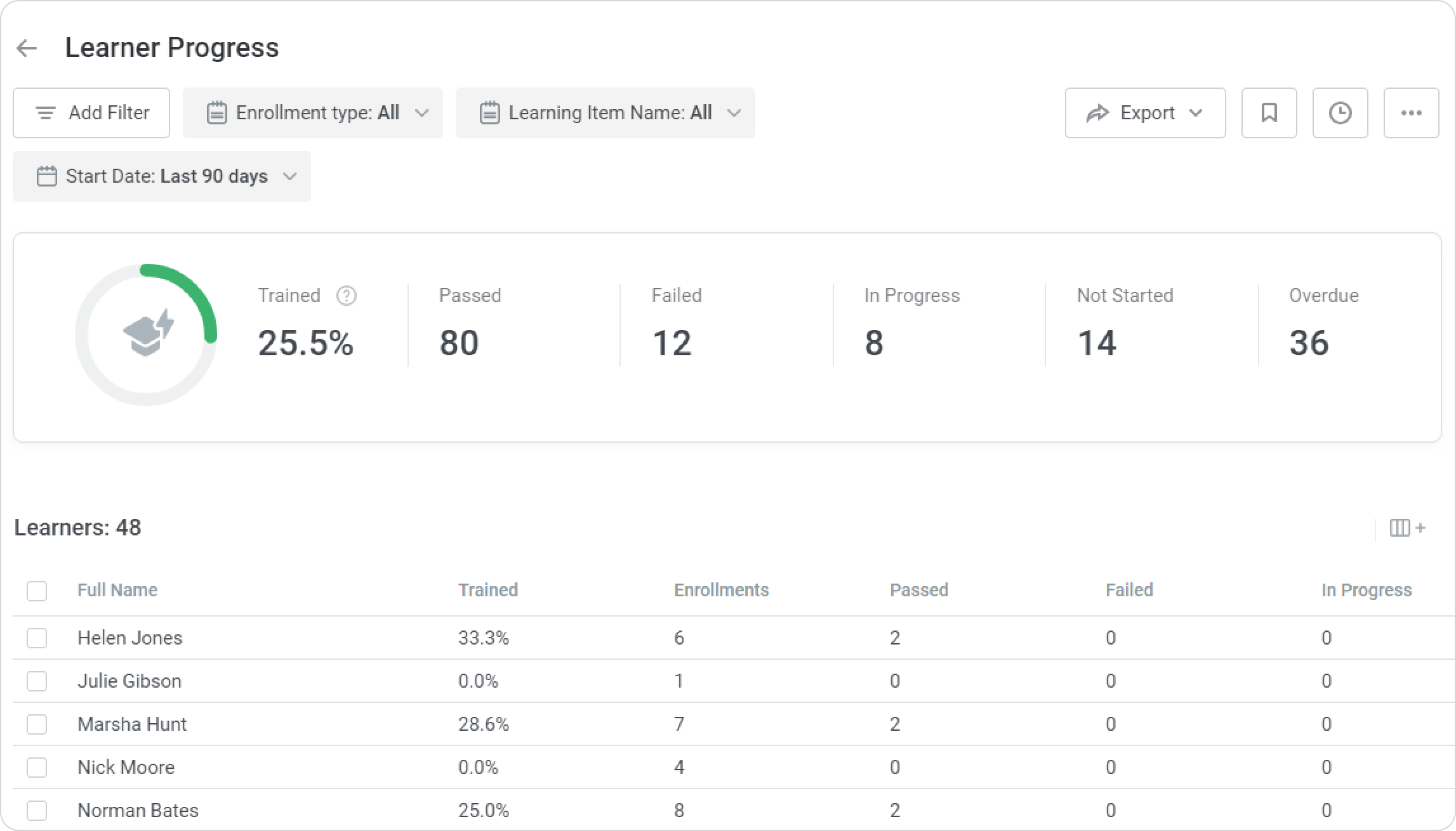A new Learner Progress report is an easy and convenient way to find out how your employees study courses. With the report, you can easily check if users of a certain department have any overdue courses or how far learners have advanced through the content item.