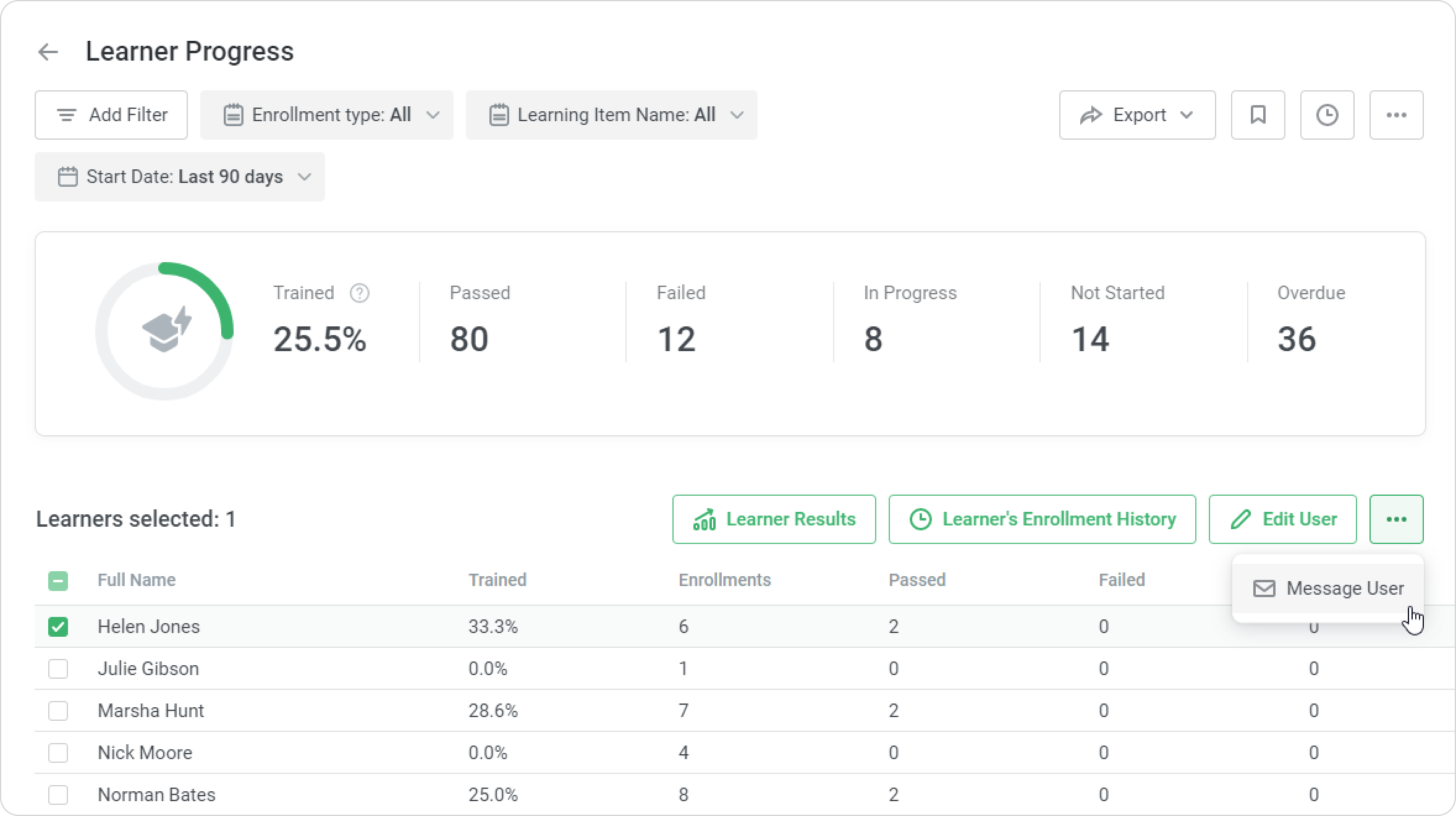 - You can edit a user's profile, check their results and enrollment history, or send them messages directly from the report.