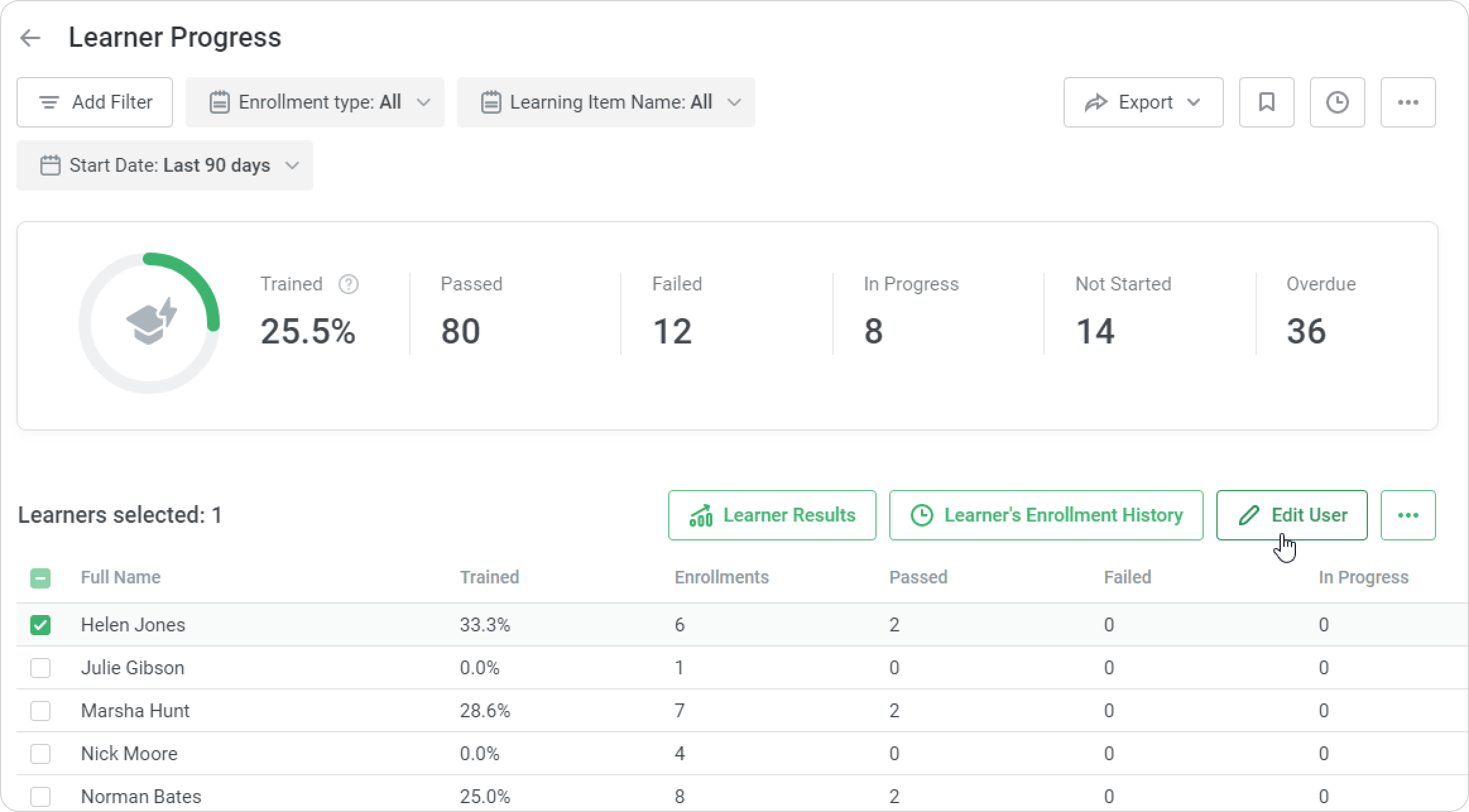 - In the learner list, select one or more learners and click Edit Enrollment.