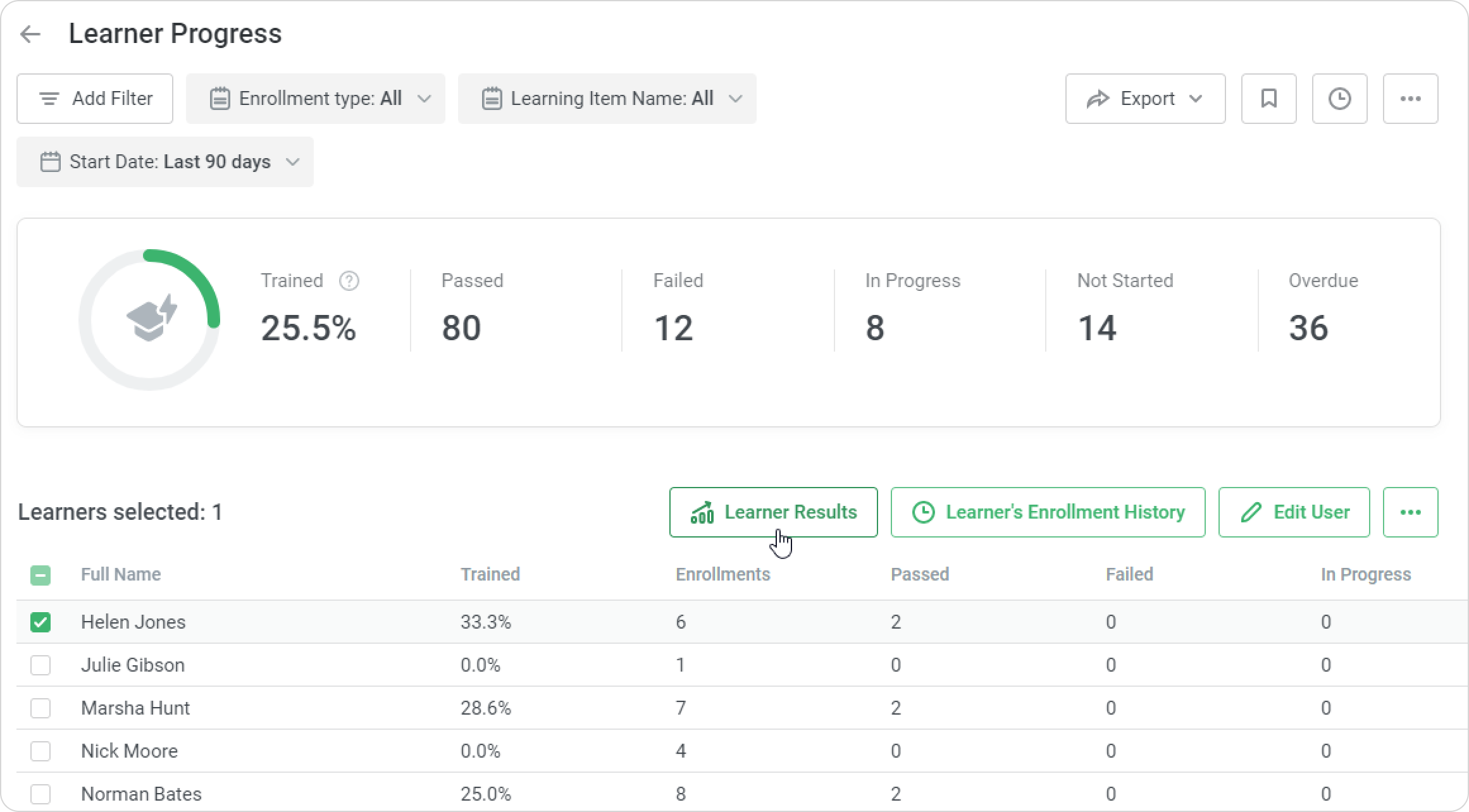 - In the Learner Progress report, select the user whose result you want to view. Then click the Learner Results button.