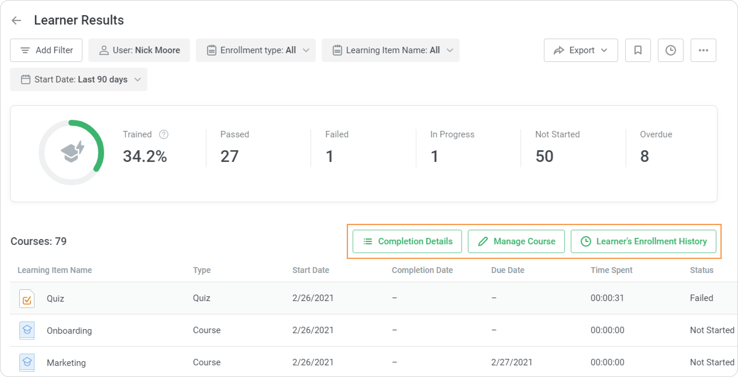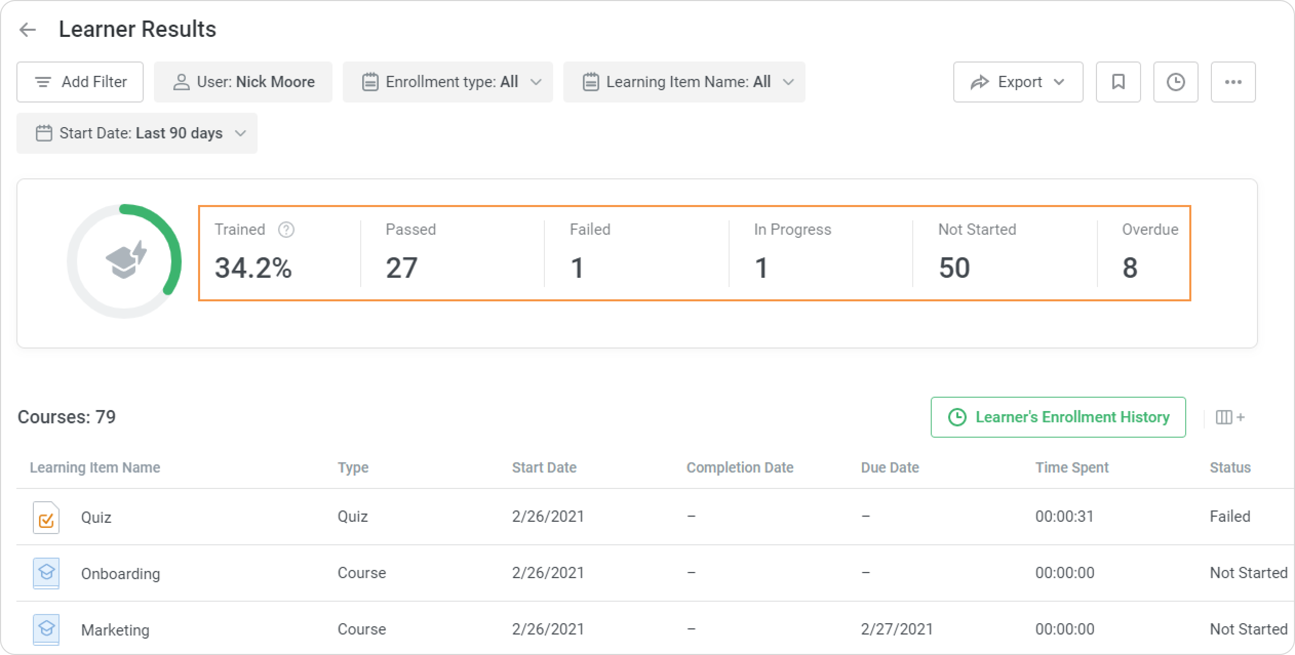 The Learner Results report is an easy and convenient way to find out how a selected employee studies their assigned courses.