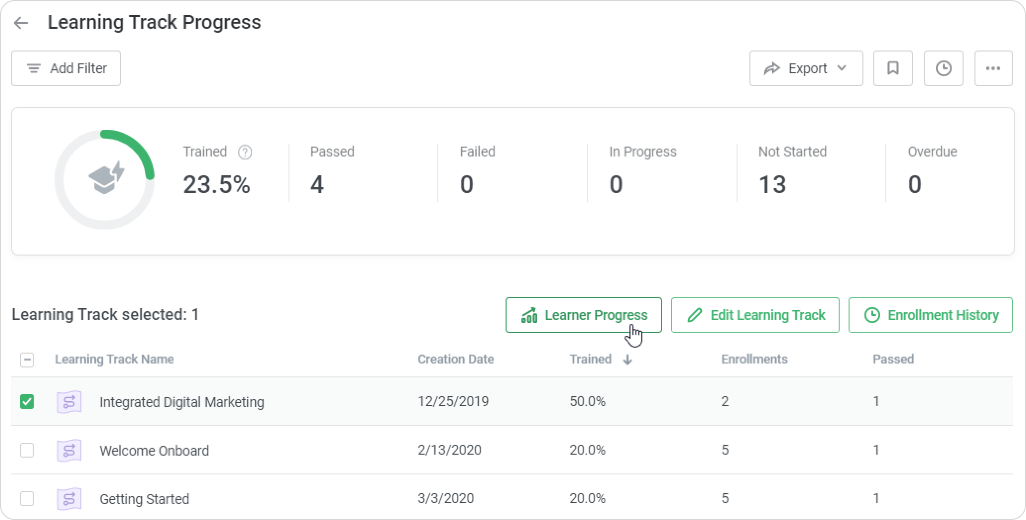 - Proceed to edit the courses that are included in the learning track and check the statistics on them right from the Learning Track Details report.