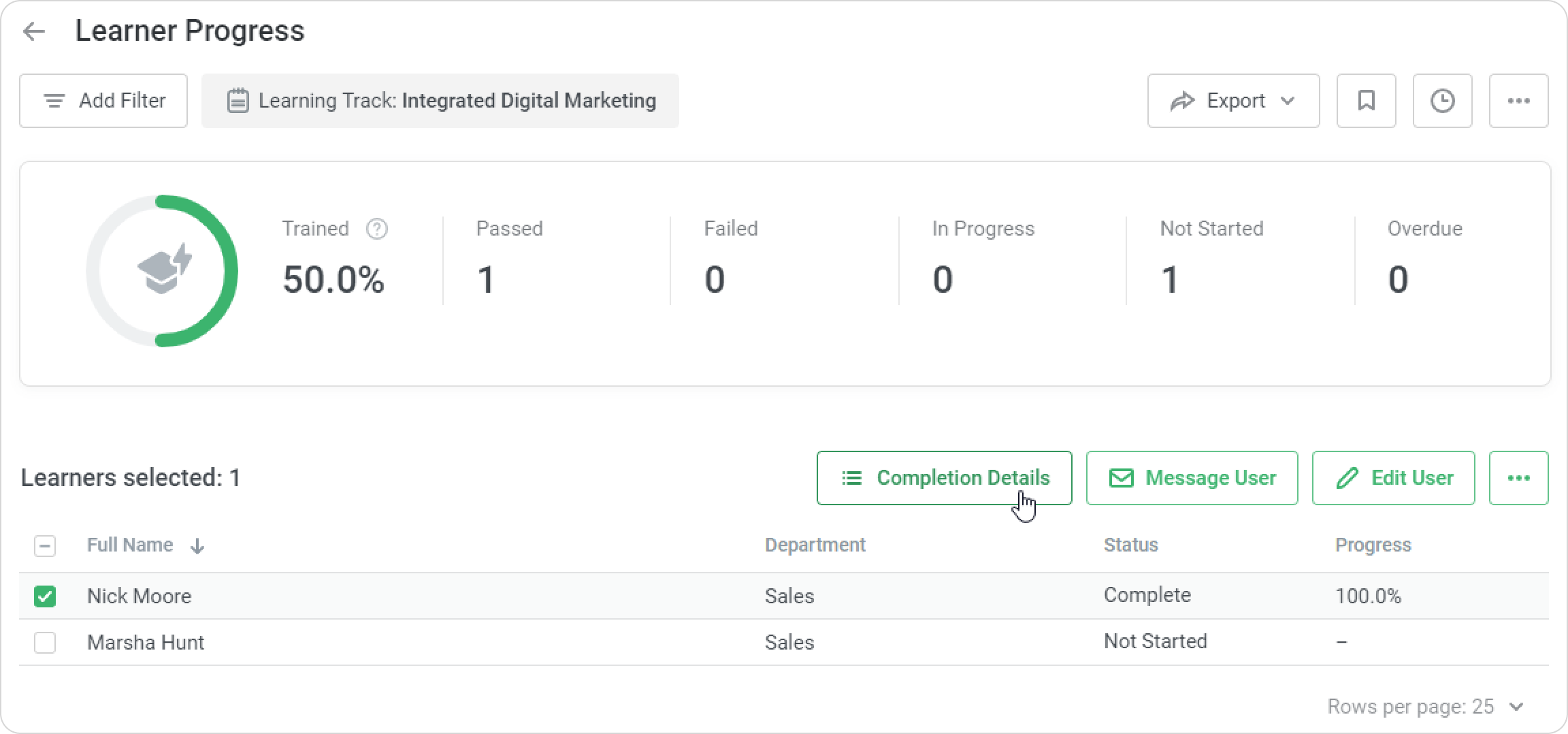 - In the Learner Progress report, select a user you would like to run a report on and click the Completion Details button.