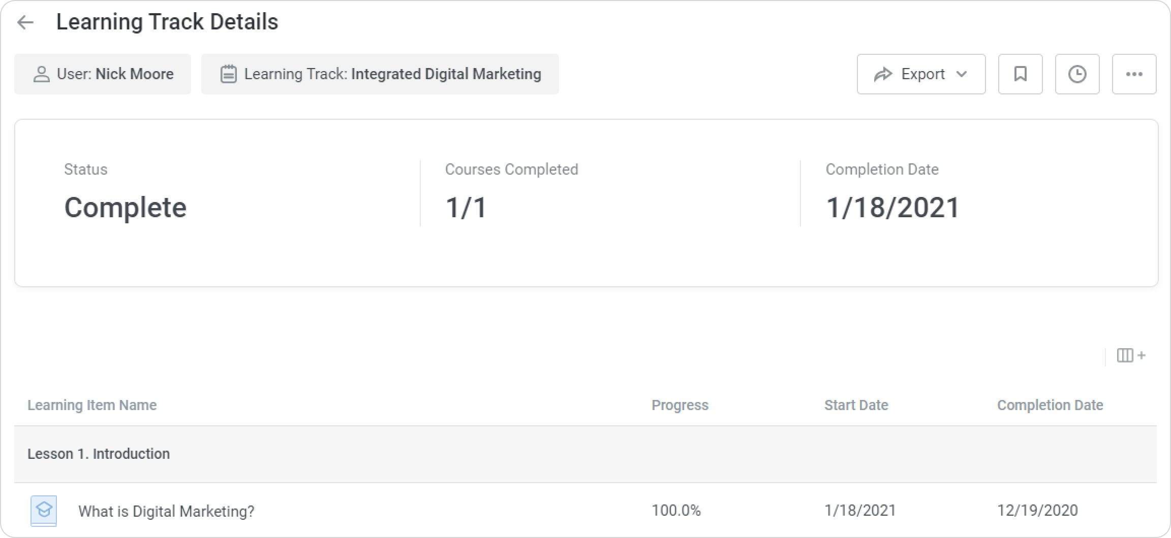 | Completion Date | The learning track completion date. If the learning track hasn't been completed yet, a dash will appear. |