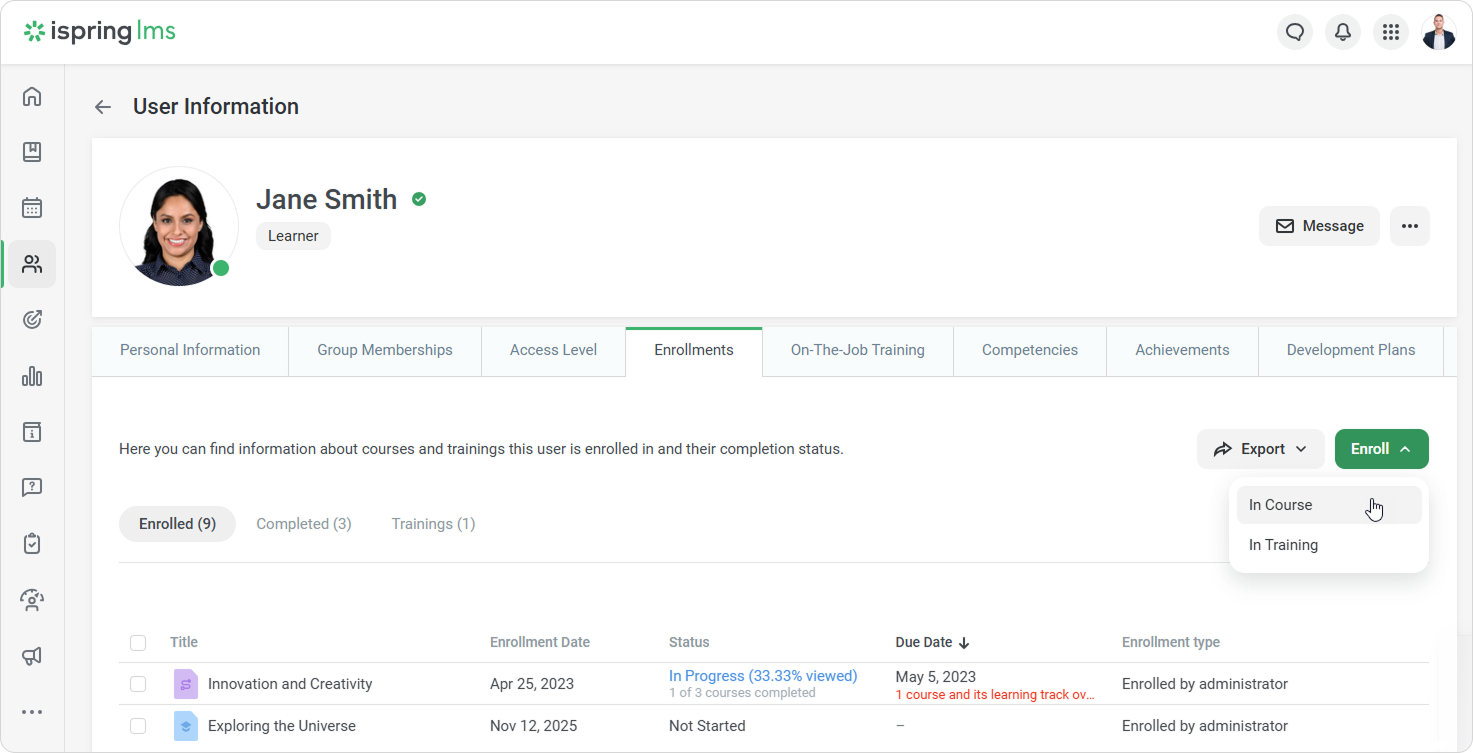 - Open the Enrollments tab. Next, click on the Enroll and select In Course.