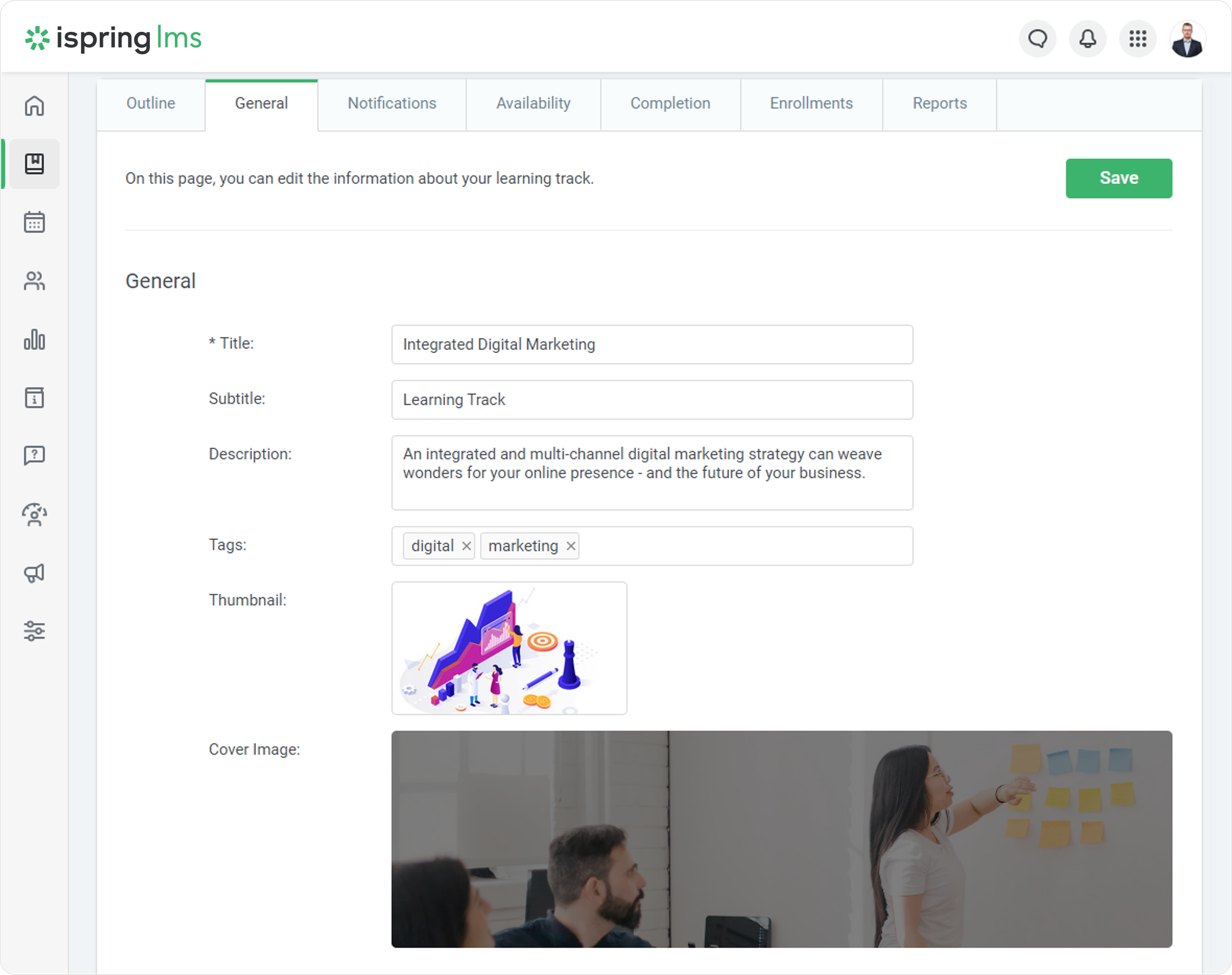 Under the General tab, you can change the name and description of a learning track, add an instructor, tags, cover and thumbnail images, copy a link, and enable certificate issuing.