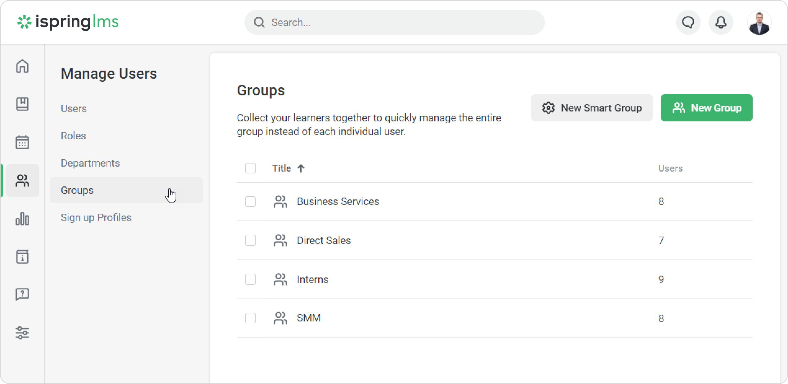 iSpring LMS Users Current: Managing Groups Managing Groups Account Owner, Administrators, and Department Administrators, as well as users assigned to custom roles, can create new groups and add users to them.To start managing groups, open the Users section and select the Groups tab. ×