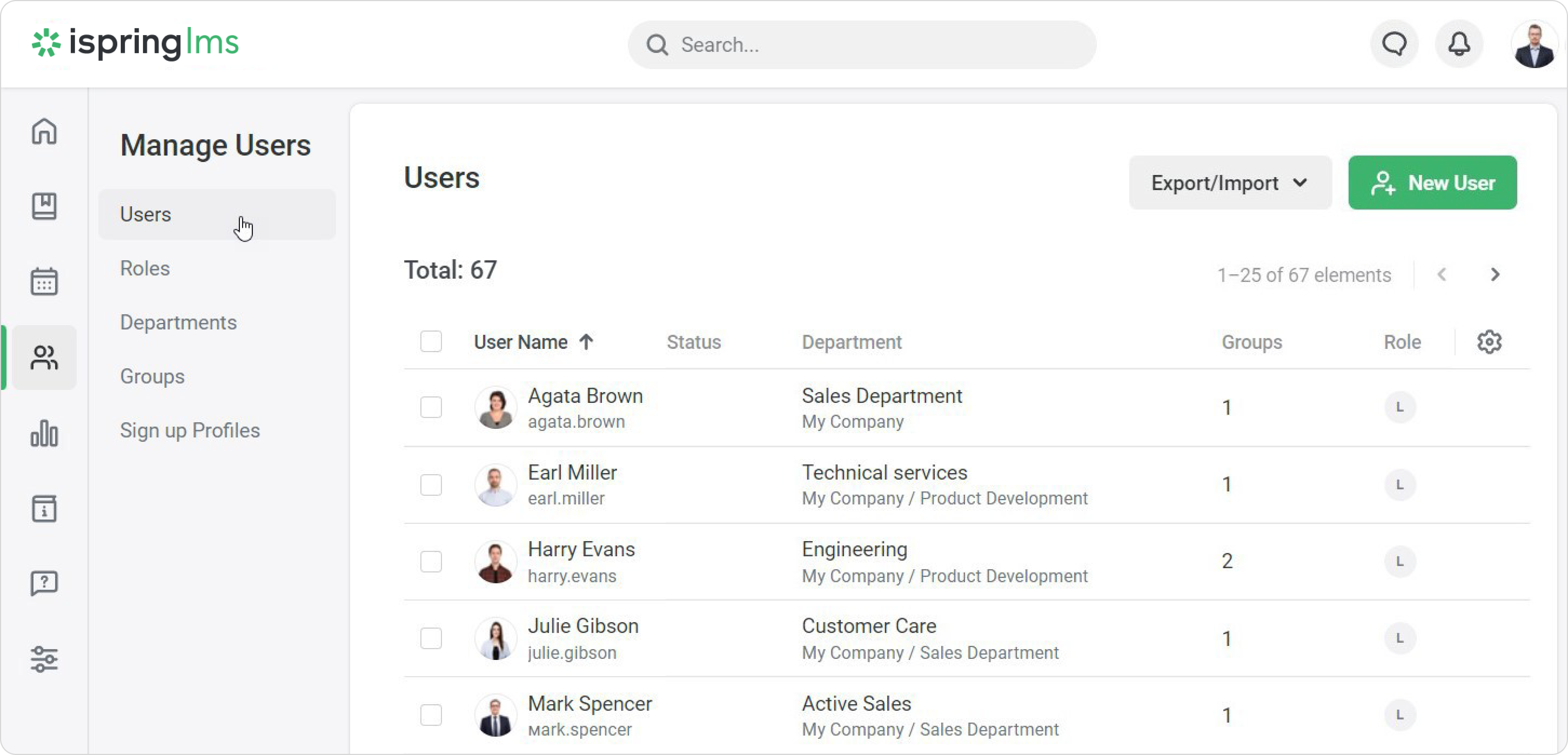 In the Users section, Account Owner, Account Administrators, Department Administrators, and users who have access to these actions according to their custom roles permissions, can manage users, their groups, and departments.