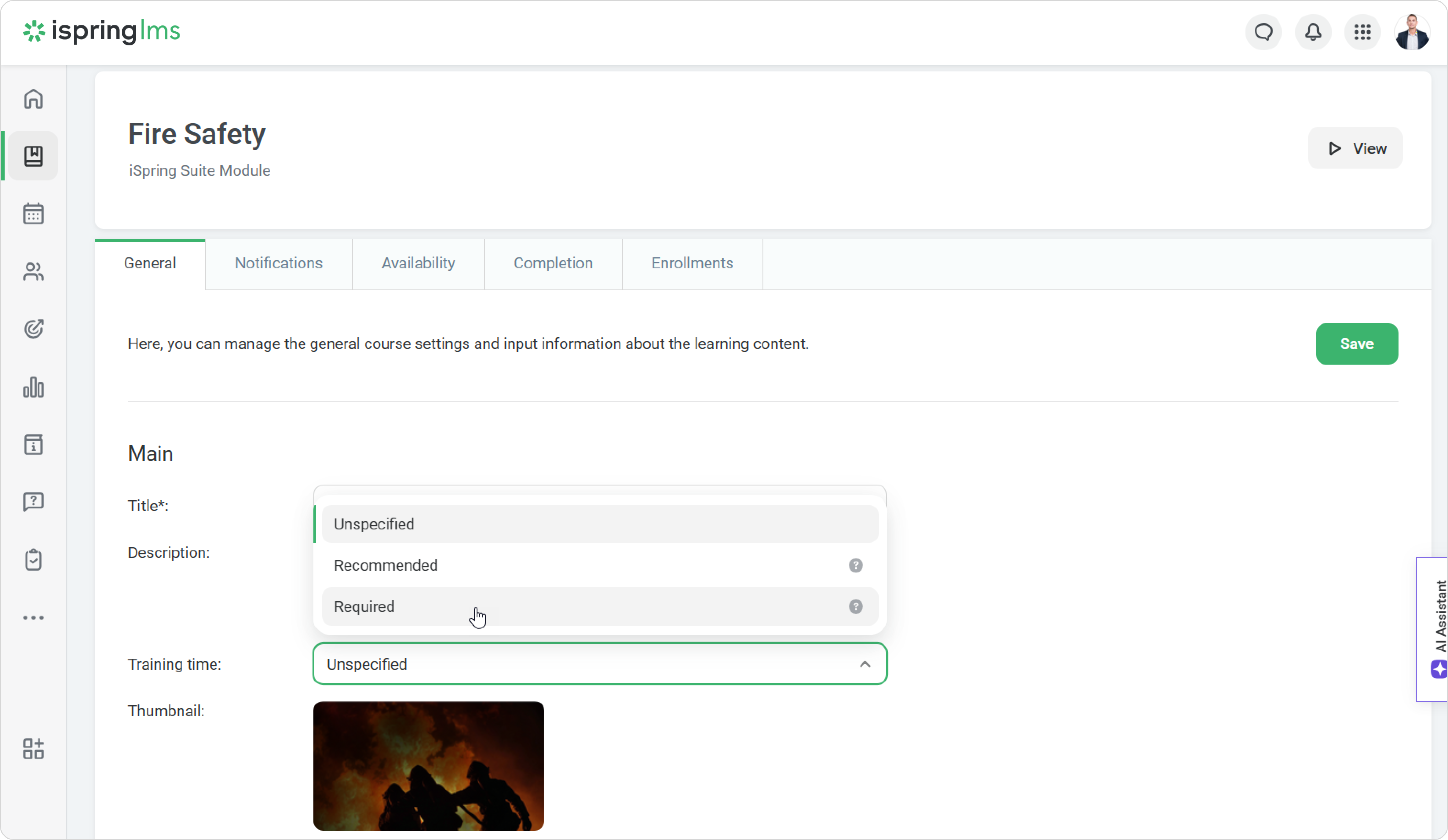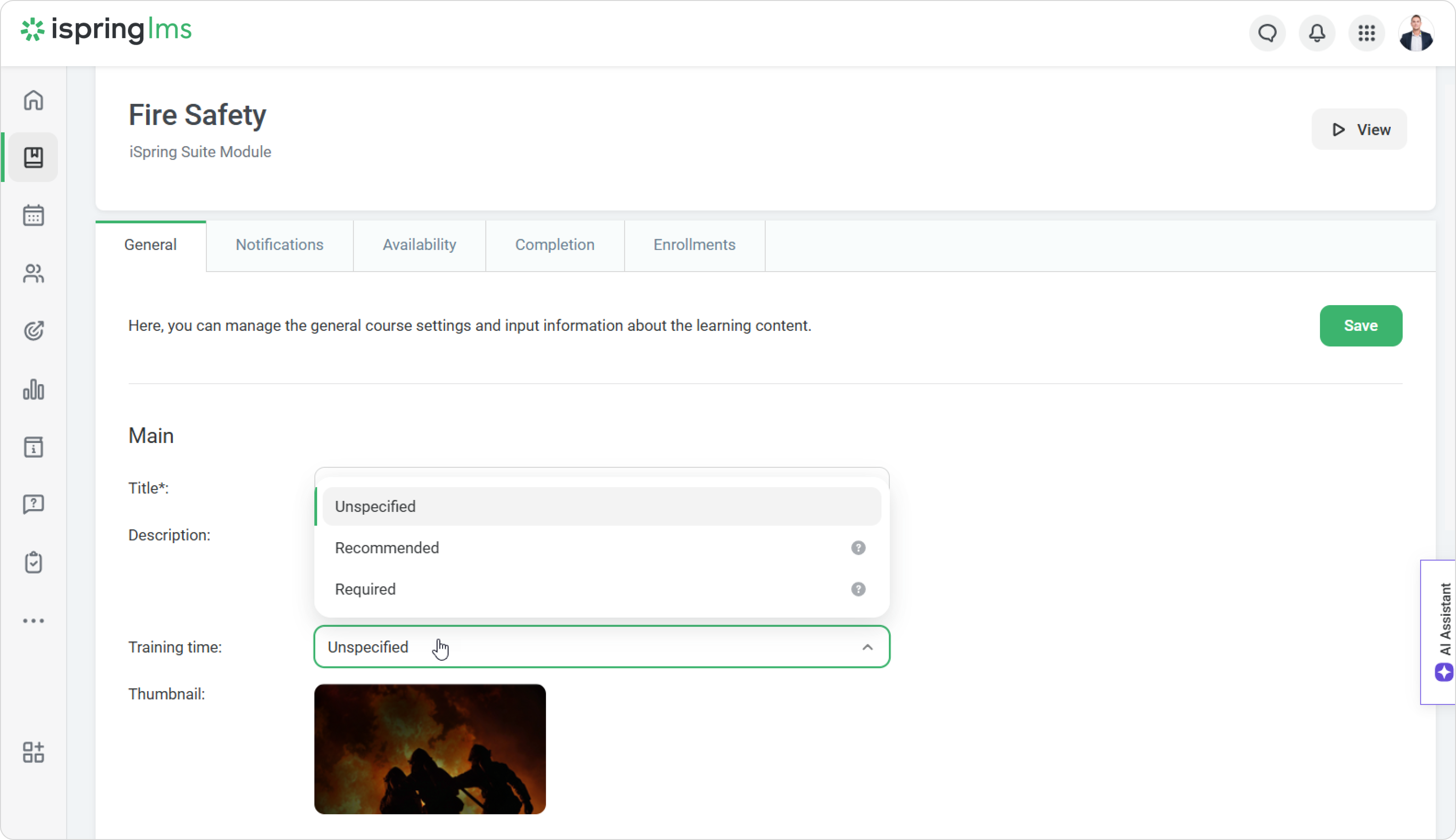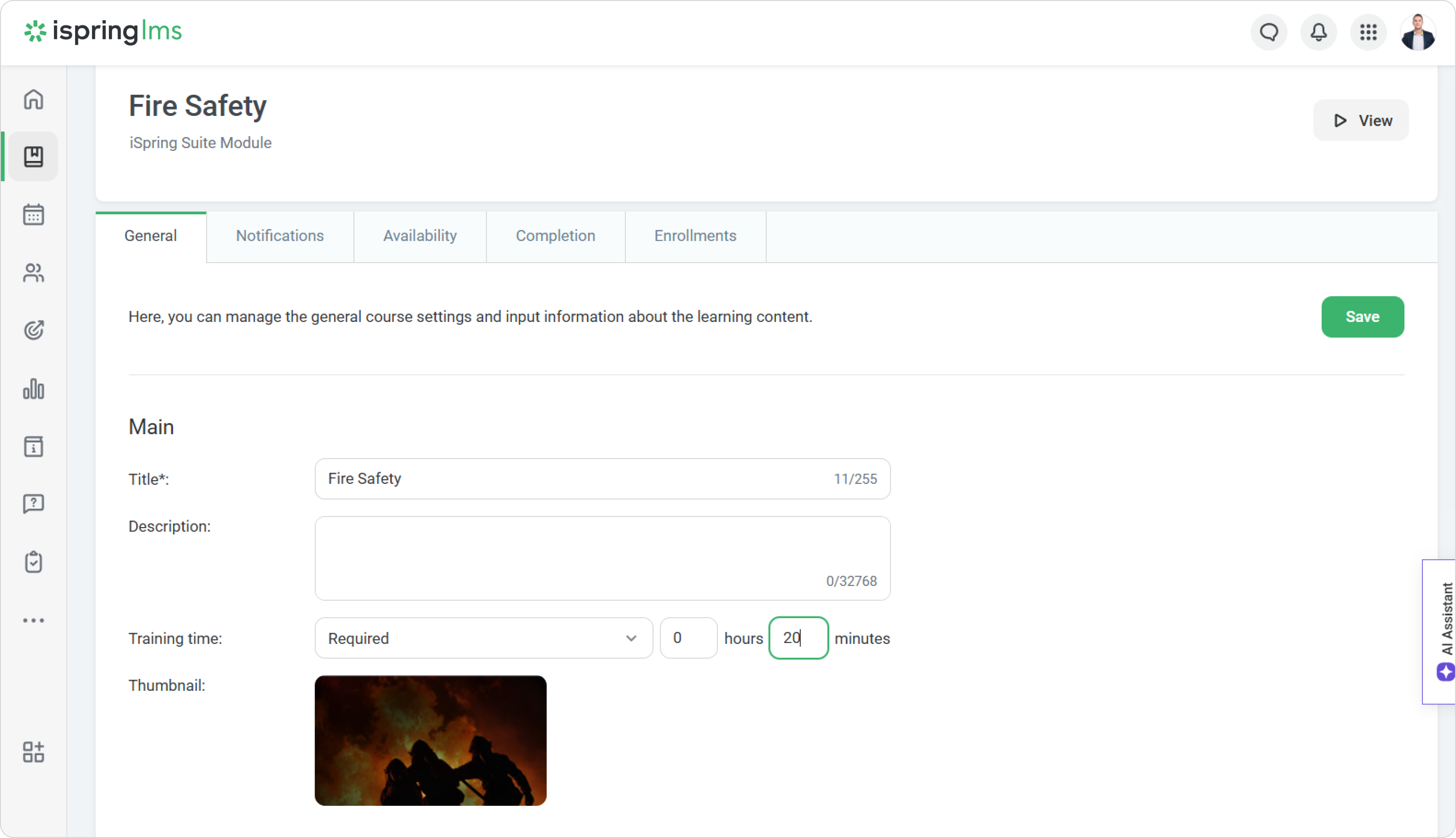 iSpring LMS Reports Current: Minimum Required Time for Course Completion Minimum Required Time for Course Completion You can set a minimum course duration to meet industry training requirements and ensure compliance. Required time can be set for iSpring Suite presentations. Select a presentation and click on Edit.On the General tab open Training time.Select Required from the drop-down list.Set a required time, e.g., 20 minutes.Click on Save. Courses with required training timeThe required completion time is displayed:On the course card.On the course page.When you launch a course, the platform will show the minimum time required to complete it.You can see a timer while you're taking the course.Completed courses show both the required and actual time spent learning. ×