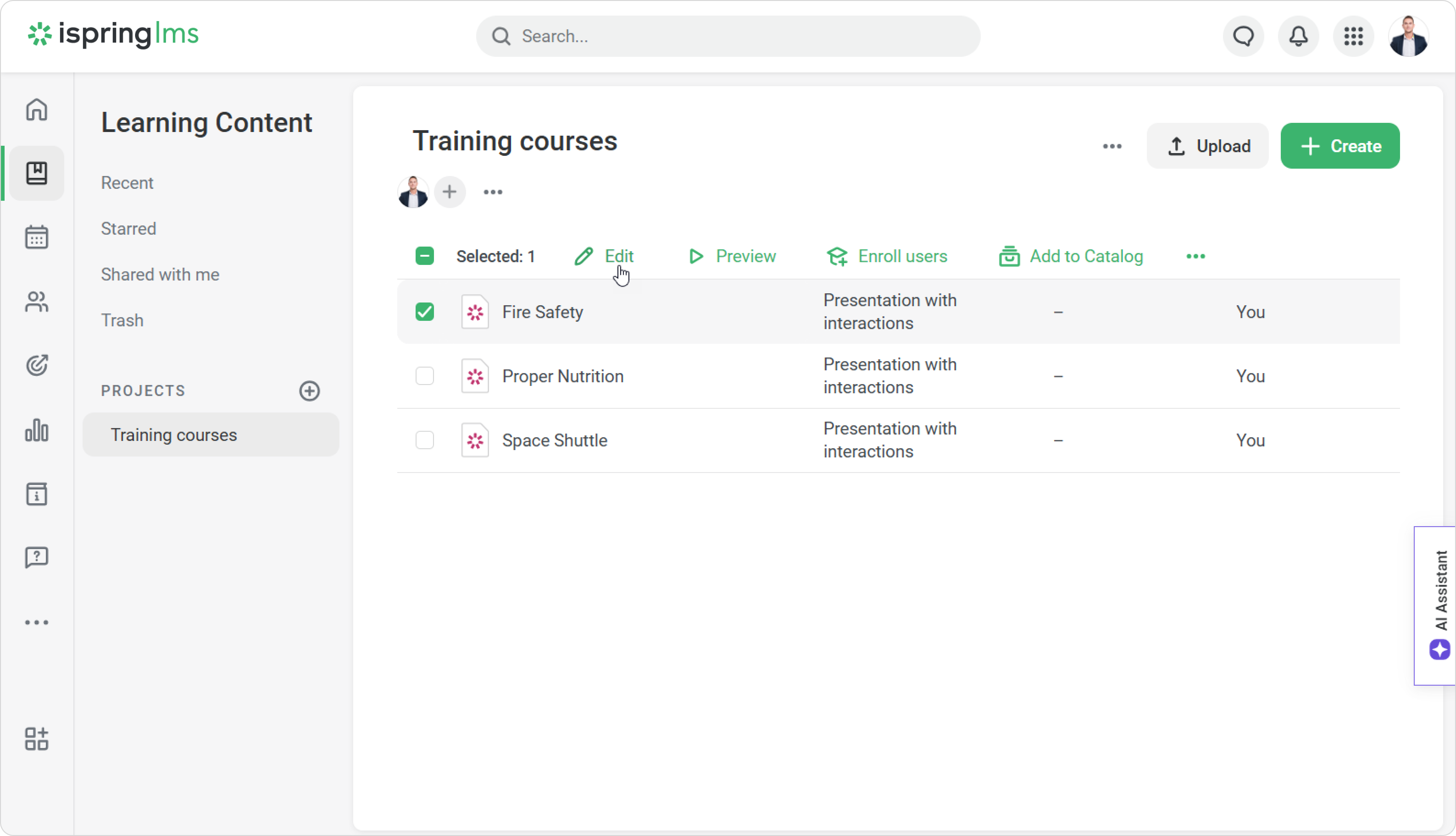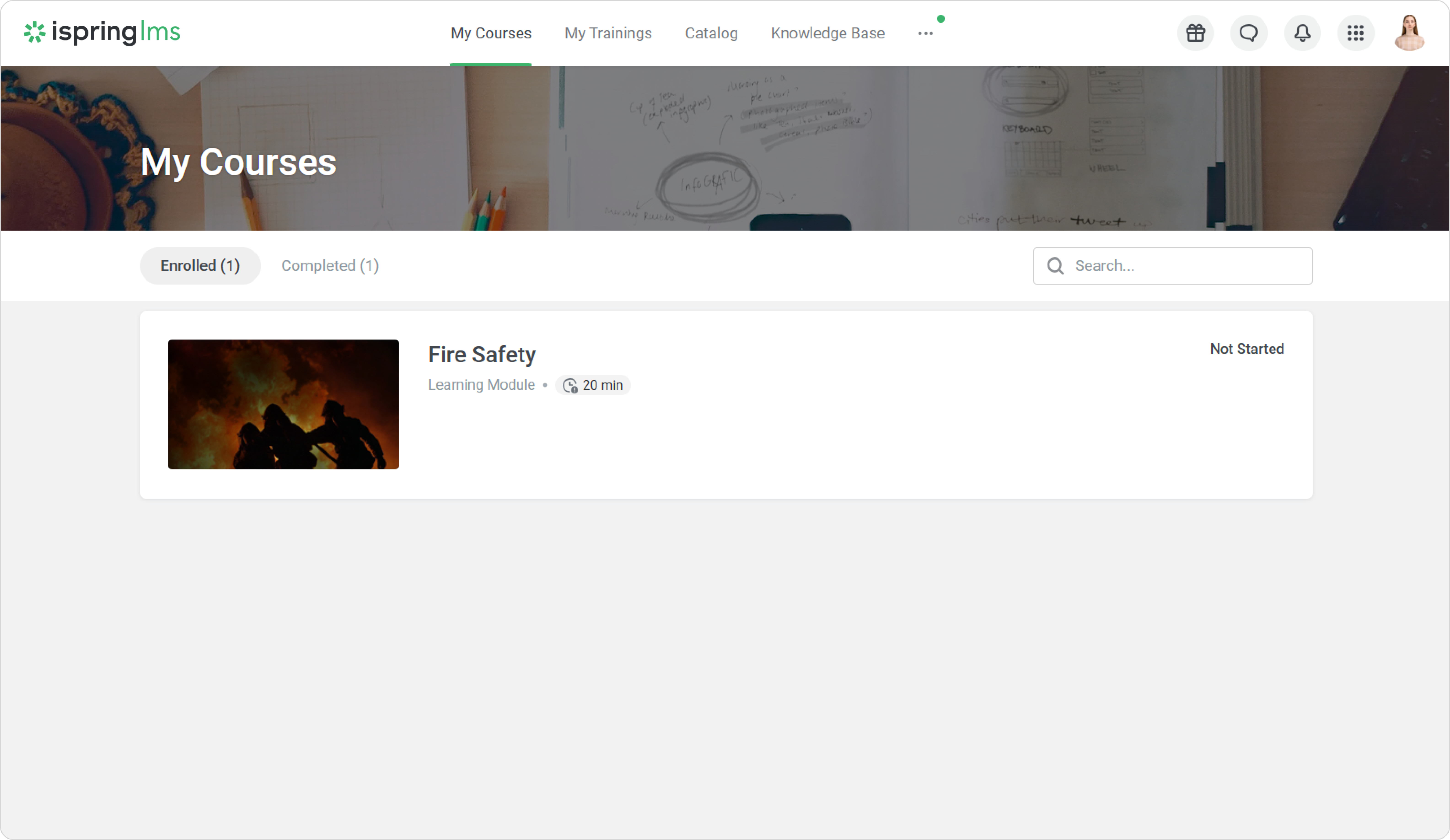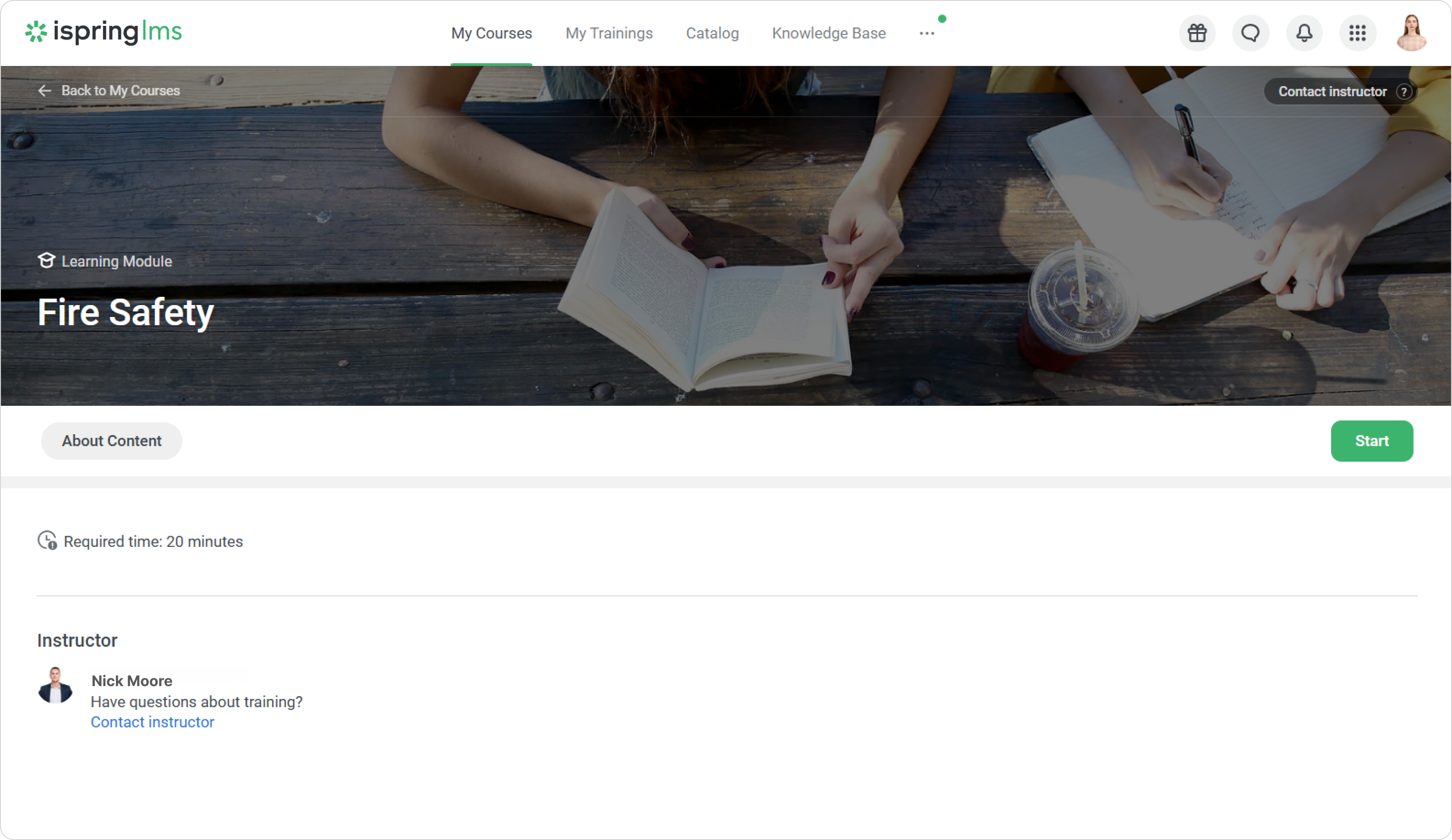 iSpring LMS Reports Current: Minimum Required Time for Course Completion Minimum Required Time for Course Completion You can set a minimum course duration to meet industry training requirements and ensure compliance. Required time can be set for iSpring Suite presentations. Select a presentation and click on Edit.On the General tab open Training time.Select Required from the drop-down list.Set a required time, e.g., 20 minutes.Click on Save. Courses with required training timeThe required completion time is displayed:On the course card.On the course page.When you launch a course, the platform will show the minimum time required to complete it.You can see a timer while you're taking the course.Completed courses show both the required and actual time spent learning. ×