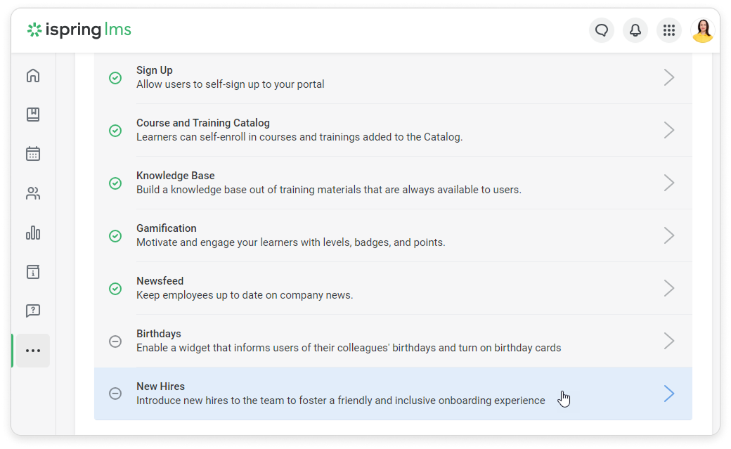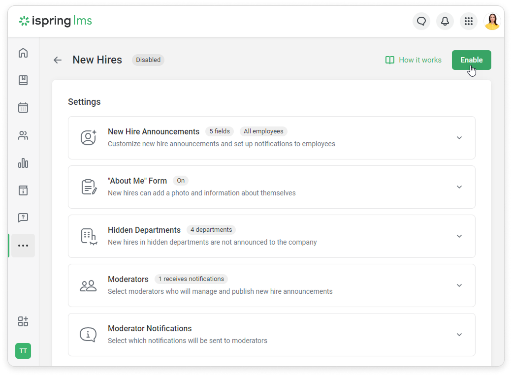 Users can get these notifications only with the (paid) iSpring LMS Business plan.- To prompt a new hire to fill in the form, when they enter the learning portal, select Enable "About Me" form.