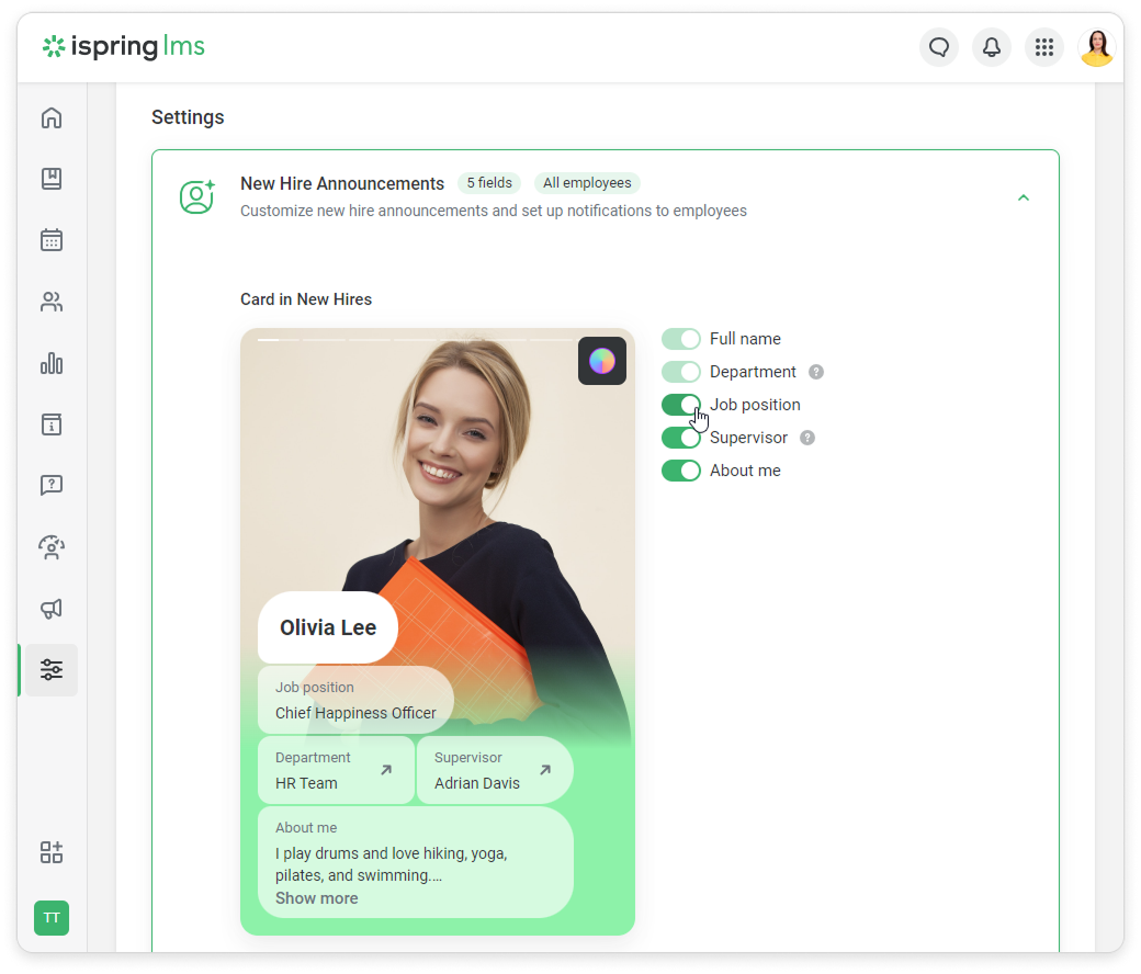 Open New Hire Announcements and select which fields will be shown in the announcement: Job position, Supervisor, or About me. The Full Name and Department fields are added by default, and cannot be disabled.