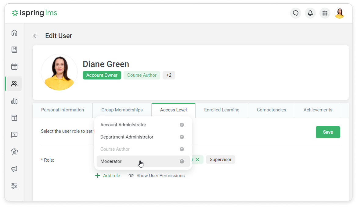 - To add a moderator, go to the Manage Users section and assign the user a role with access permission to Moderate new users announcements.