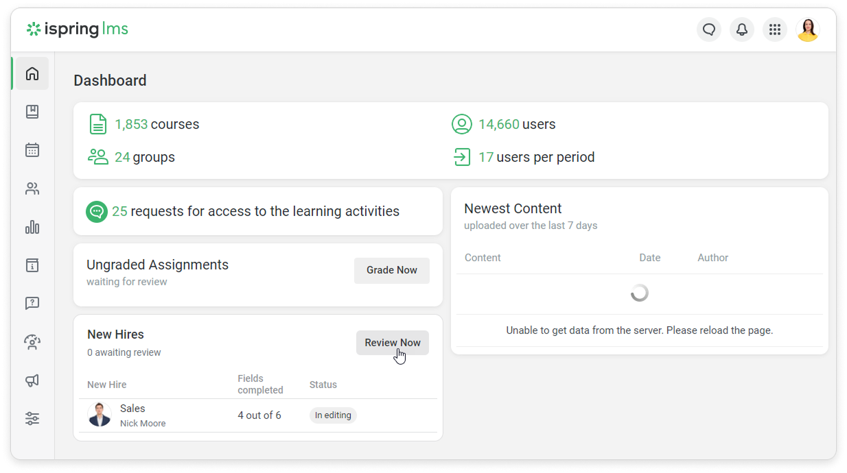 Moderators will see a widget with a list of new hires, fields completed, and status on their Dashboard.