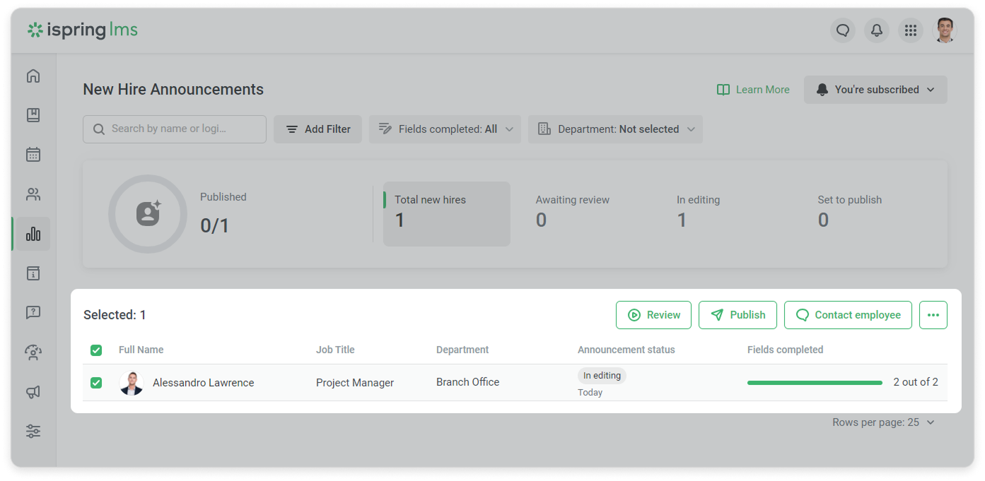 - Select a user whose announcement needs to be reviewed. You can click Review, Publish, Contact employee, or Delete.