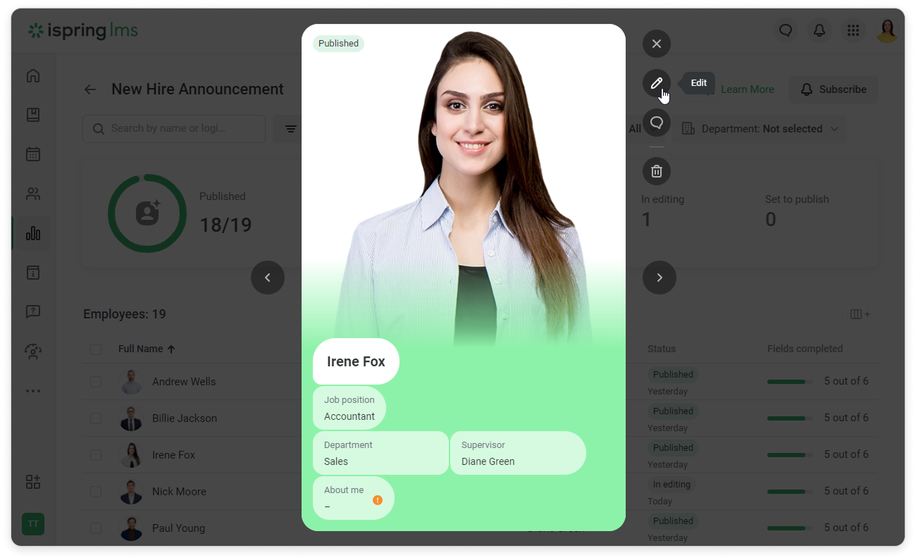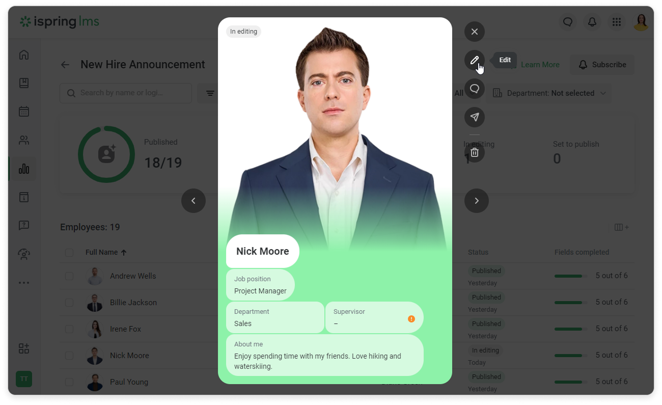 - When you click Review, you'll see a new hire announcement. You can use buttons on the right to edit, publish, or delete an announcement, or contact an employee.