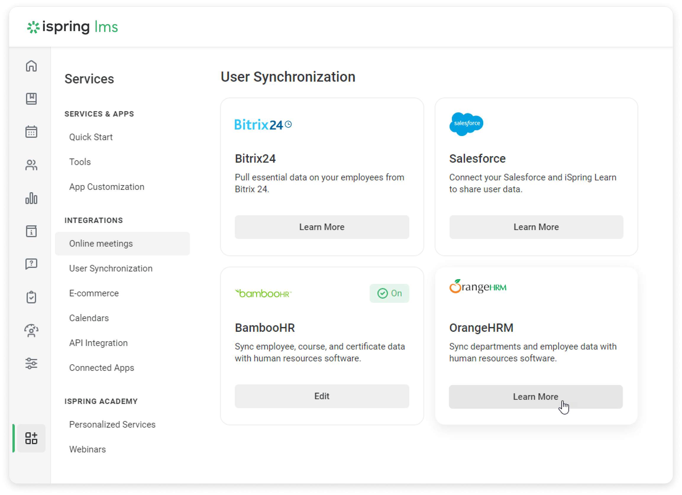 - Go to the iSpring LMS Services section and click on Integrations → User Synchronization. Then, find OrangeHRM and click on Learn More.