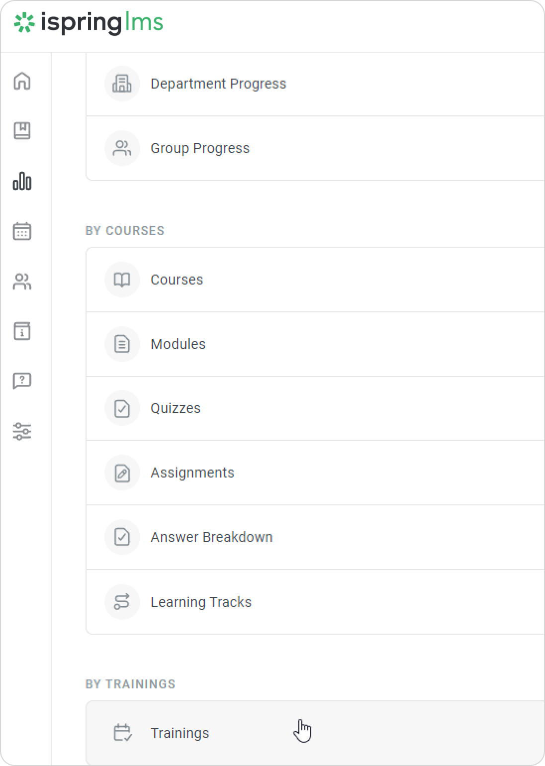 Trainings that were created by the user with a custom role and trainings that were added by users from the departments they manage and their sub-departments