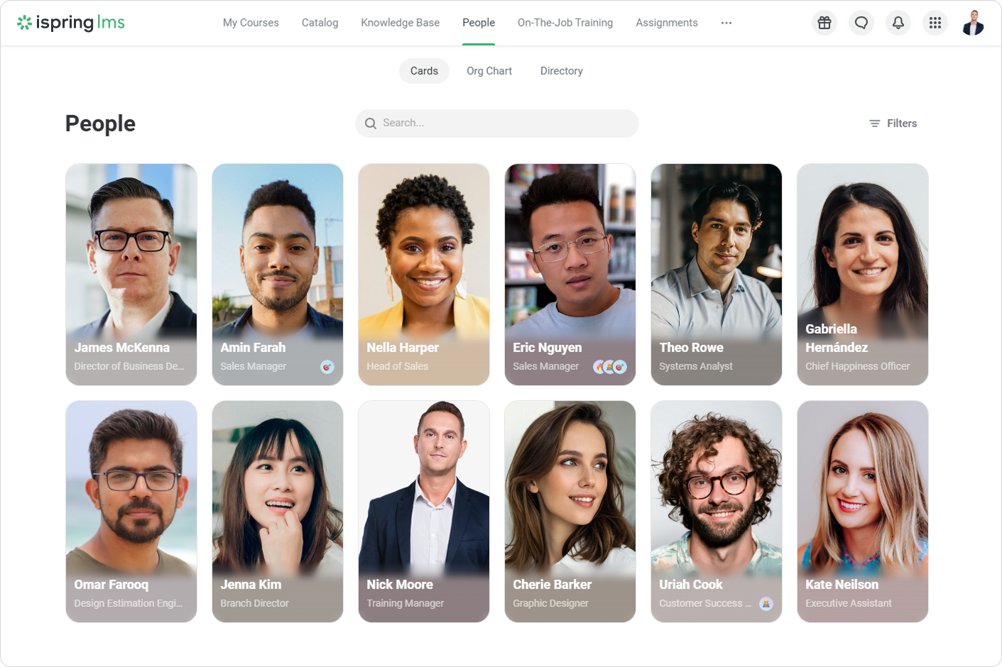 iSpring LMS Settings Additional Options Current: People People In the People section, employees can learn more about their colleagues, see what departments the company is made up of, and who manages them.There are three pages in the People section: CardsOrg ChartDirectory ×
