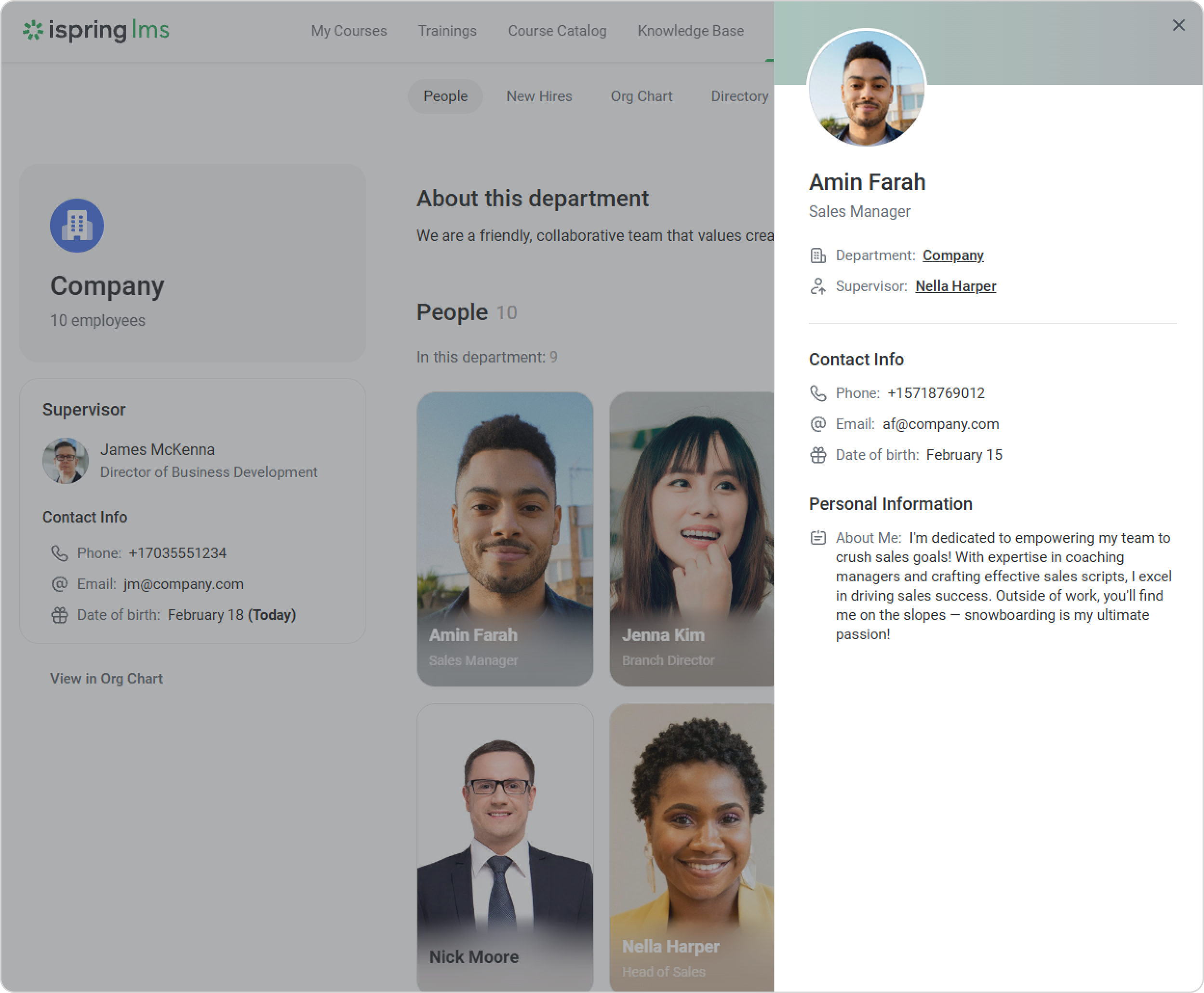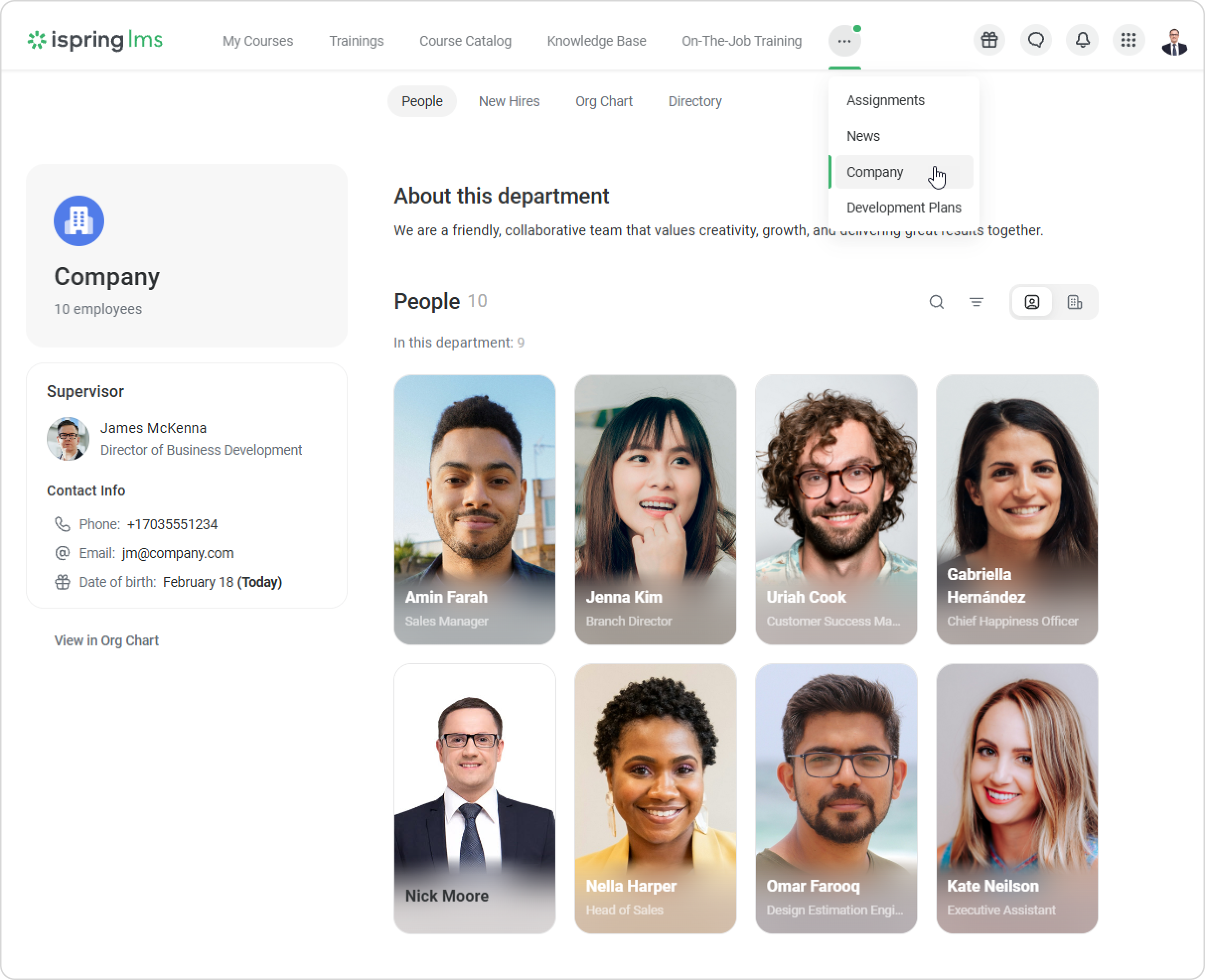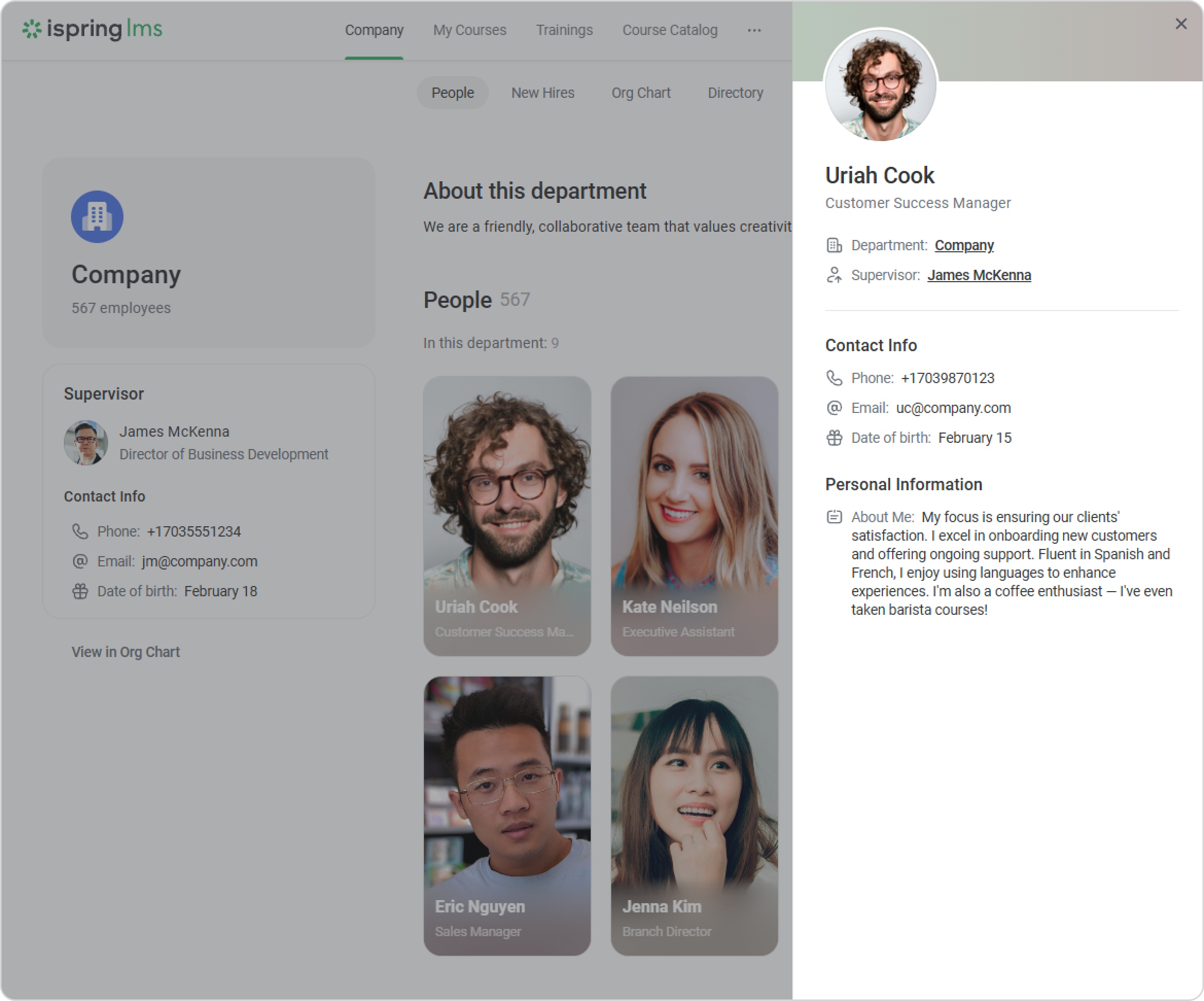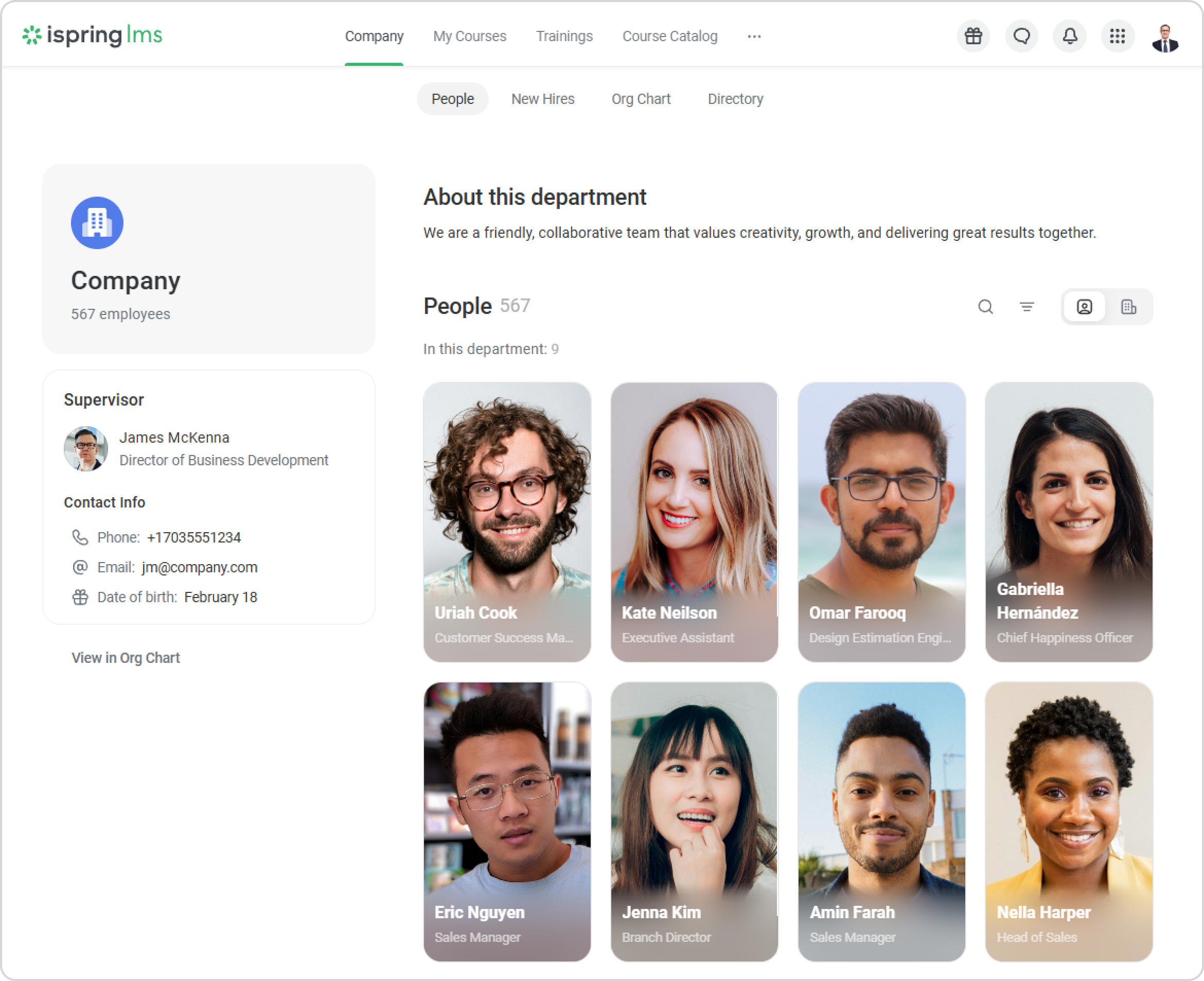 Clicking on a card will take you to the respective employee's profile, where you can find more detailed information, like the department the employee belongs to, their supervisor, and contact and personal information.