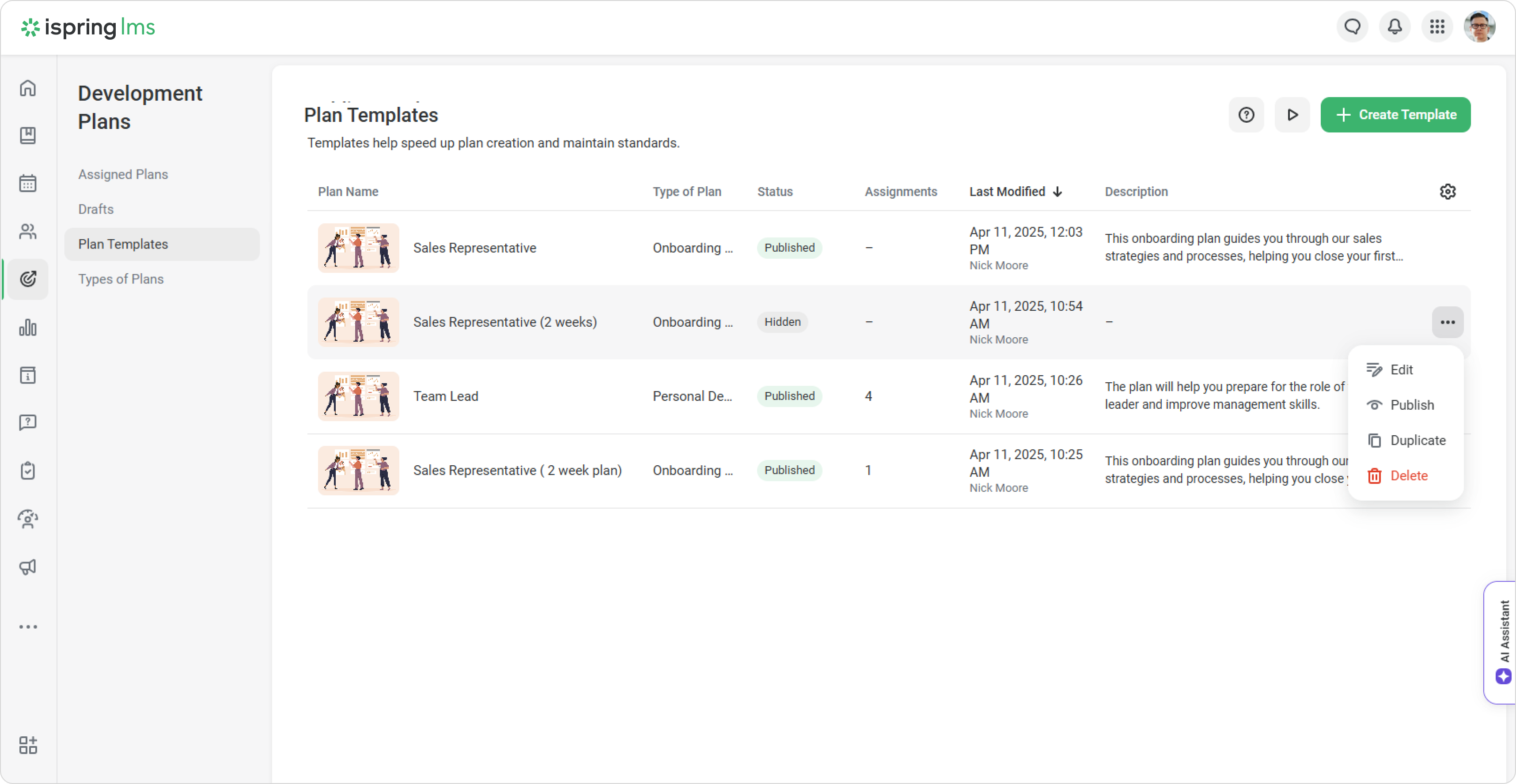 Each template will have a status: Published or Hidden. Published templates can be used to create new plans. You will see how many times a template has been used in the Assignments column.