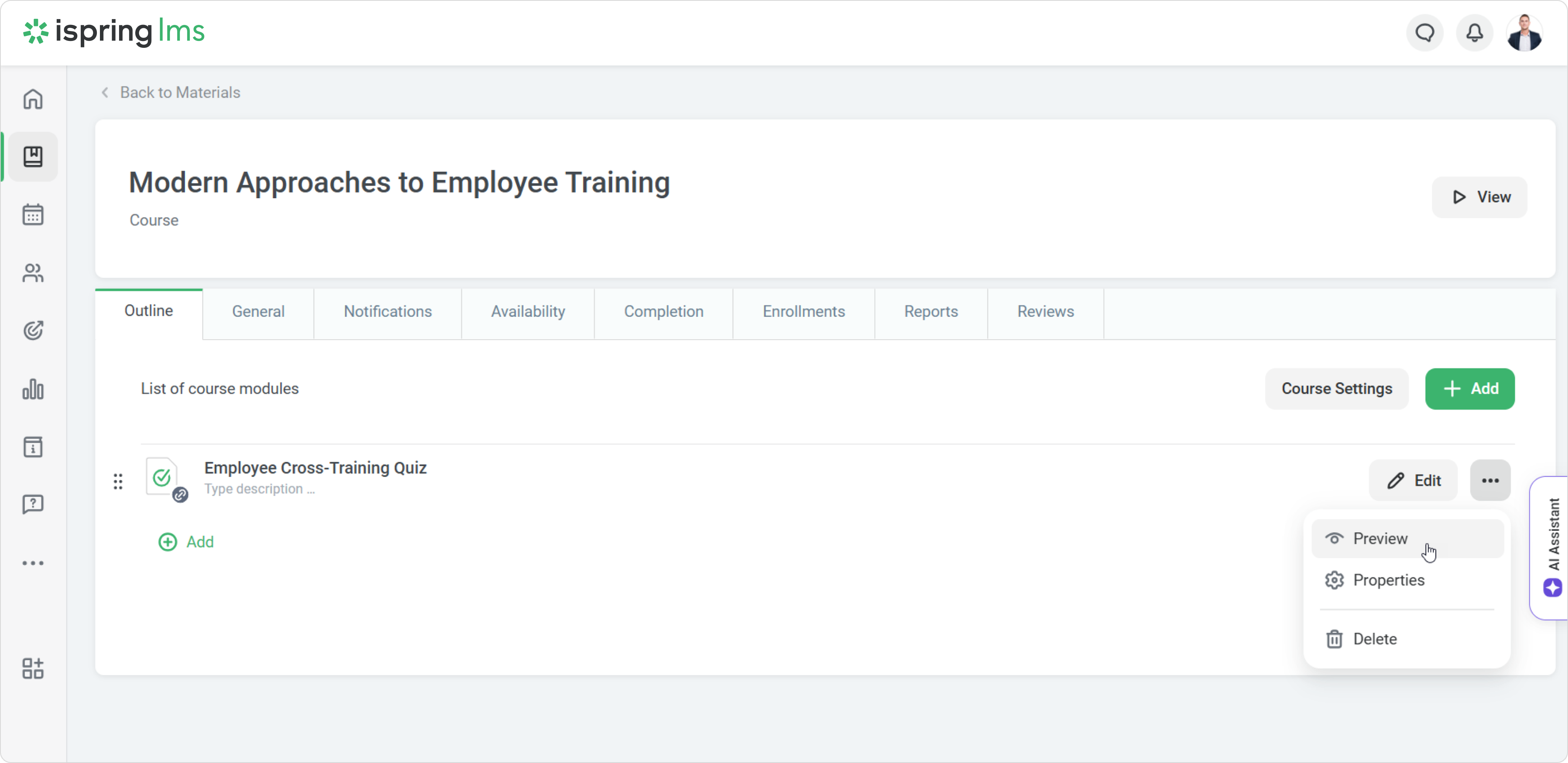 iSpring LMS Learning Content Courses Online Quizzes Current: Preview Preview To see your quiz in action, click Preview.You'll see how your quiz will look on the computer screen, tablets, and smartphones. You can also preview the quiz from the course page. The Preview option appears after you've published your quiz. ×