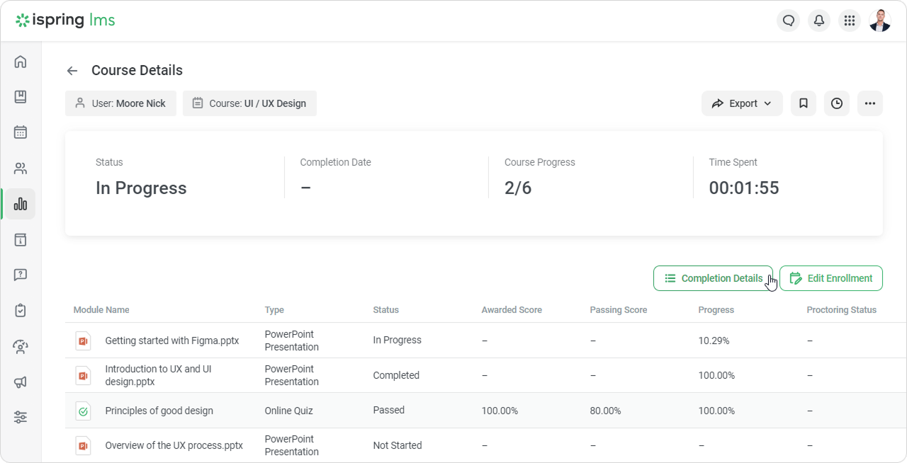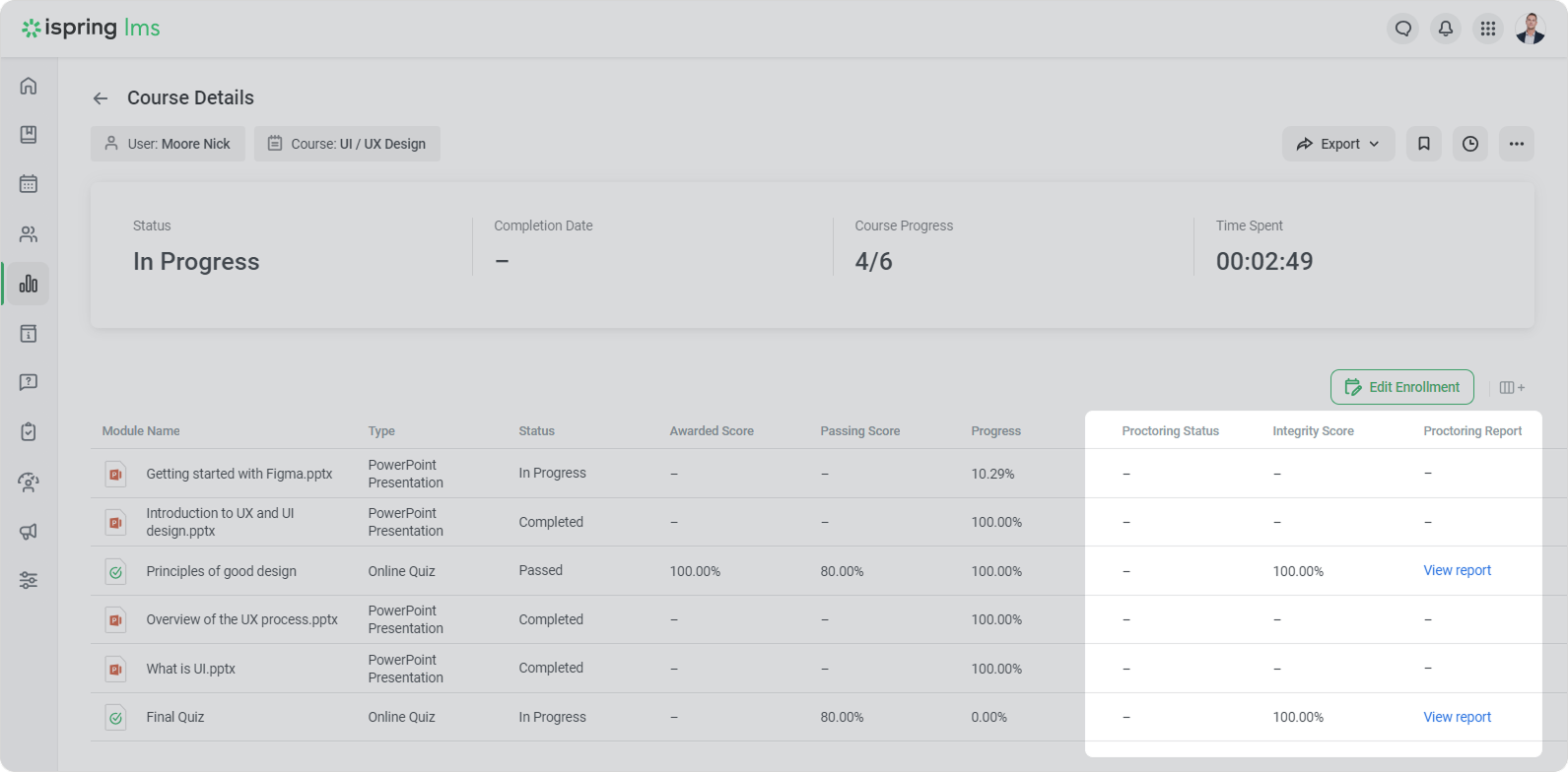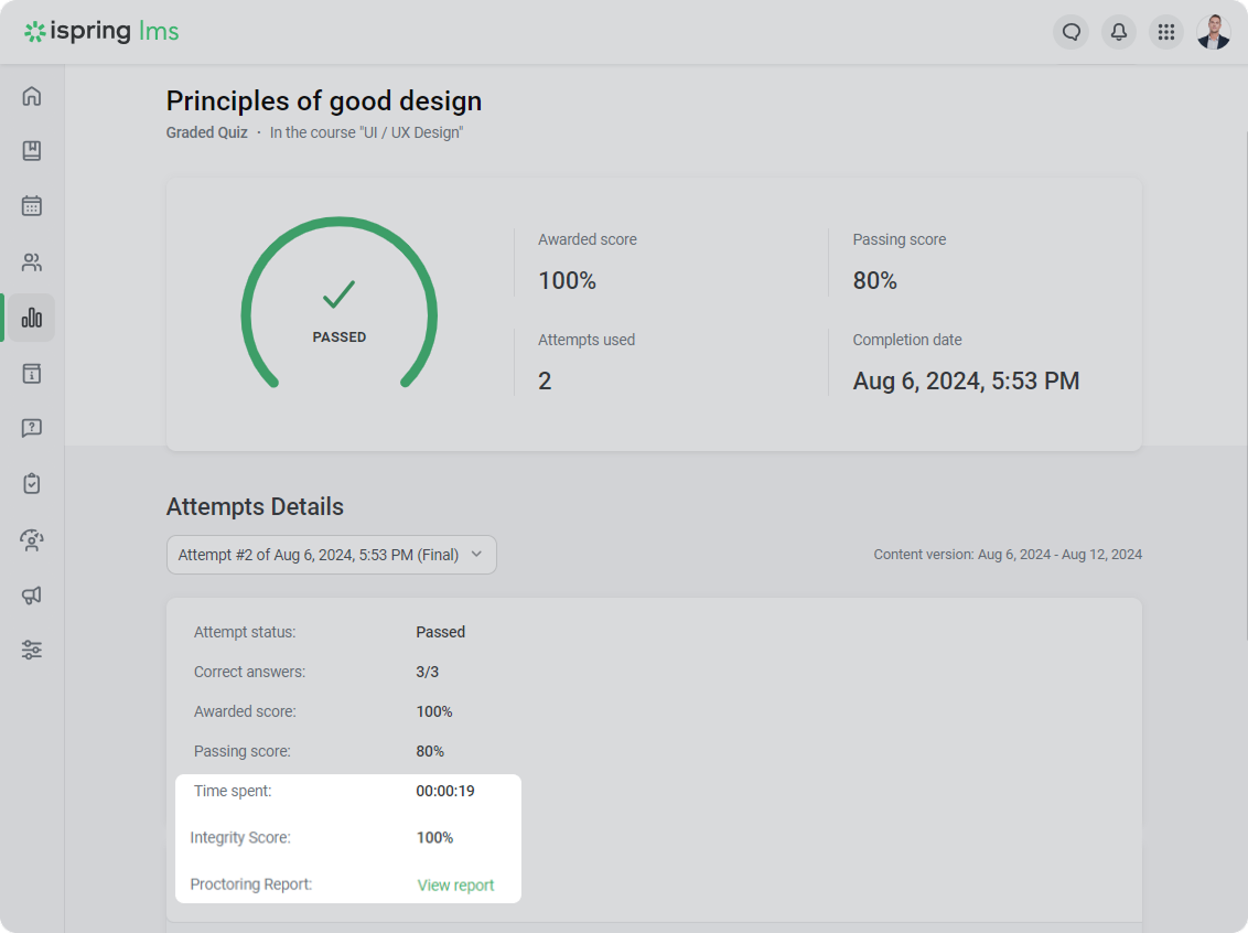 The report is now ready! It will show the best proctoring result from all attempts. You’ll see the proctoring status, integrity score, and a link to the report.