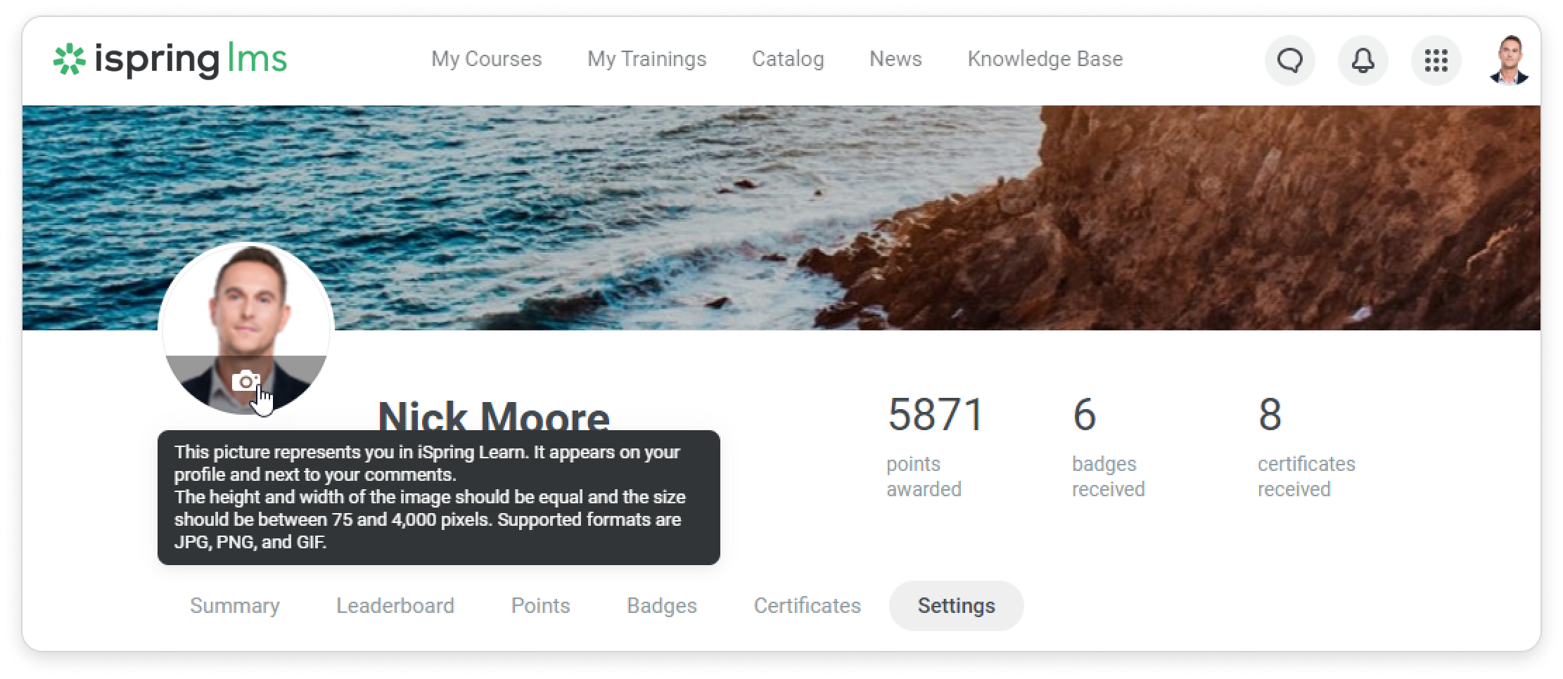 Click the default picture. The supported photo formats are JPG, PNG or GIF. A side size should be from 75 to 4,000 pixels.