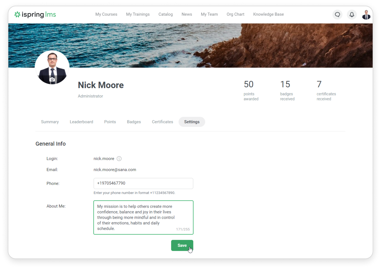 Users can add their phone number and personal information, if their Org Chart is enabled. You have a limit of 255 characters for About Me field. Don't forget to save the changes you've made.