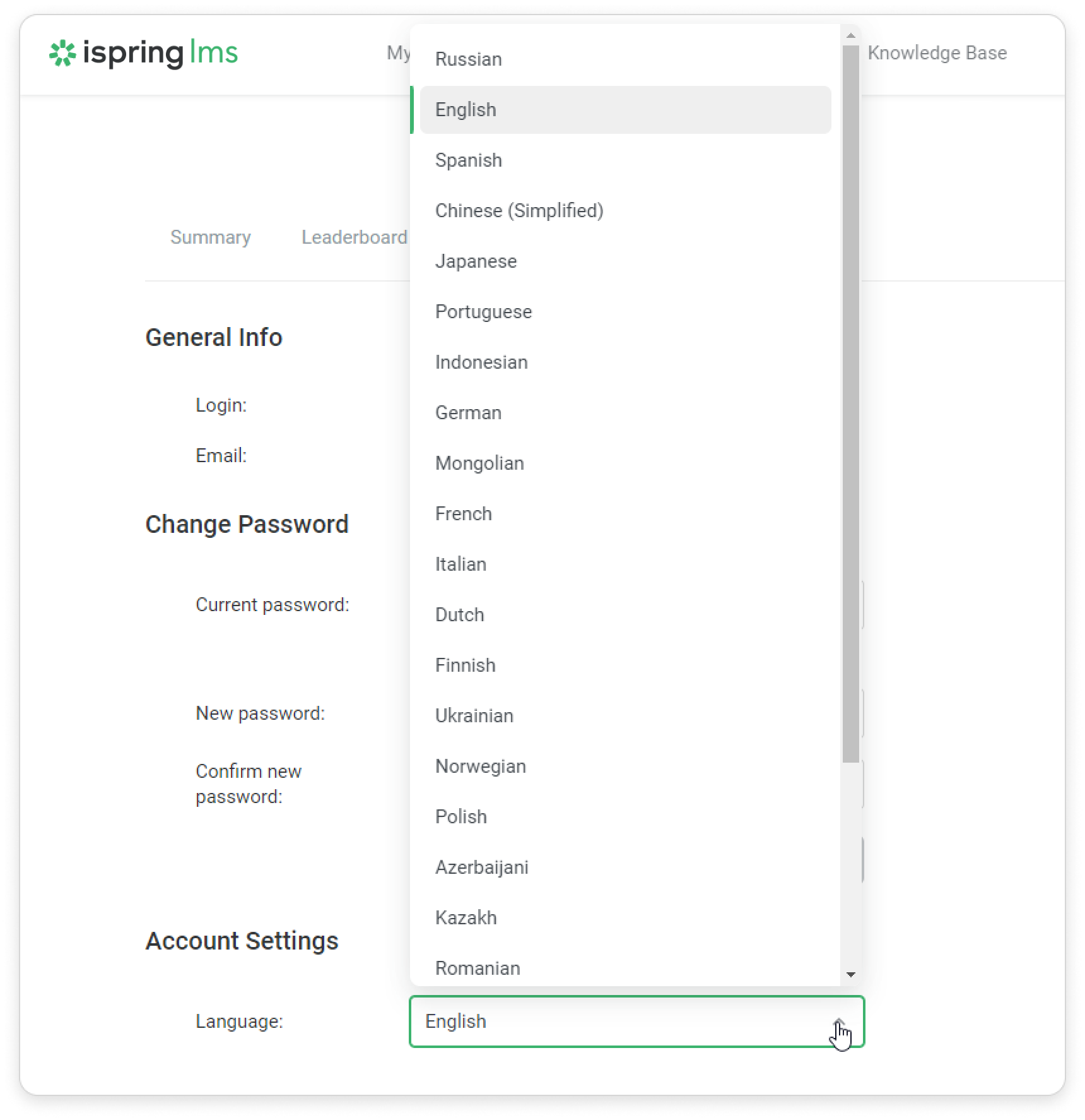 Currently, iSpring LMS includes 27 languages: English, Russian, Spanish, Simplified Chinese, Traditional Chinese, Japanese, Portuguese, German, Mongolian, French, Italian, Dutch, Finnish, Ukrainian, Norwegian, Polish, Azerbaijani, Kazakh, Romanian, Korean, Bulgarian, Czech, Uzbek, Danish, Greek, Arabic, Indonesian and Catalan.