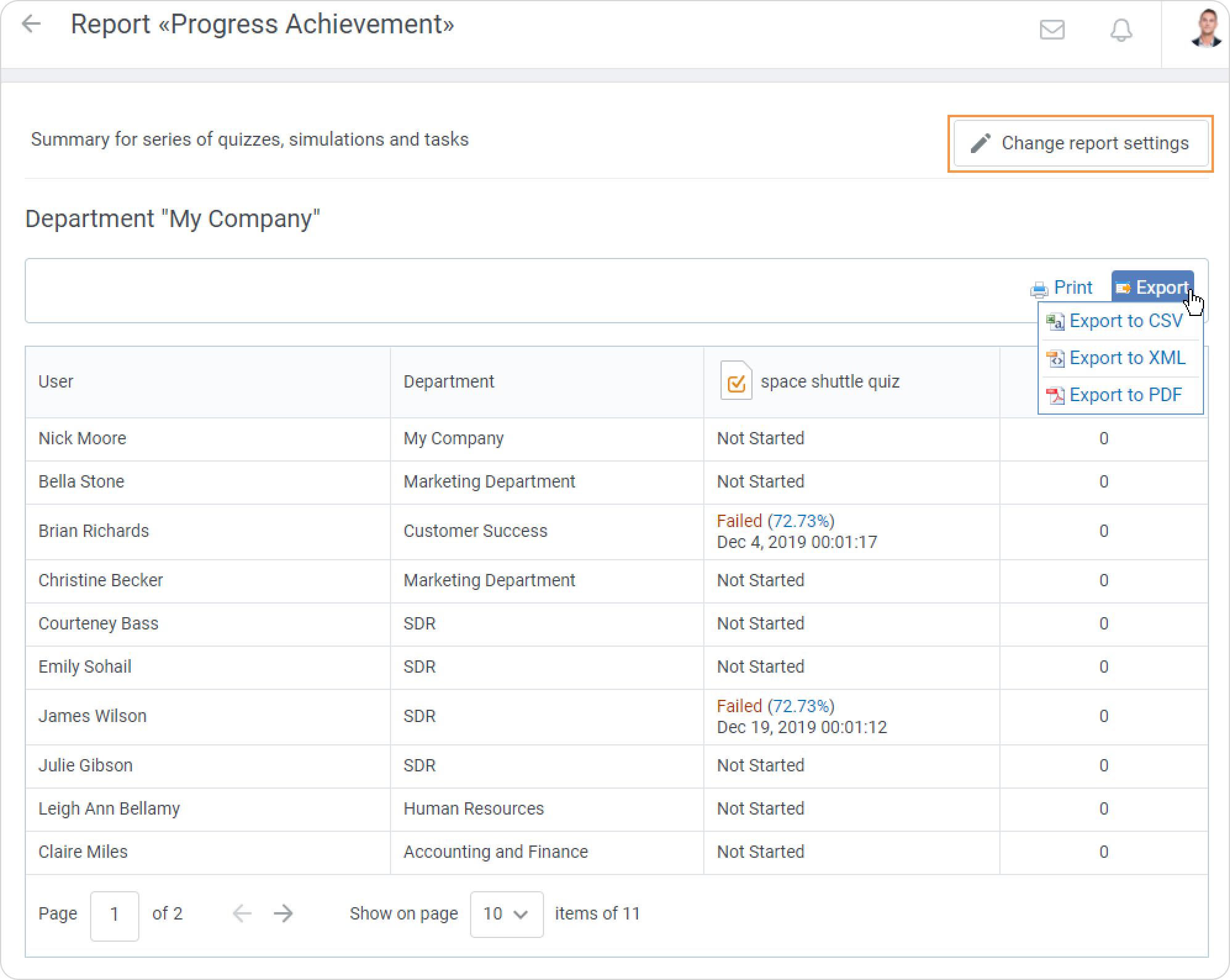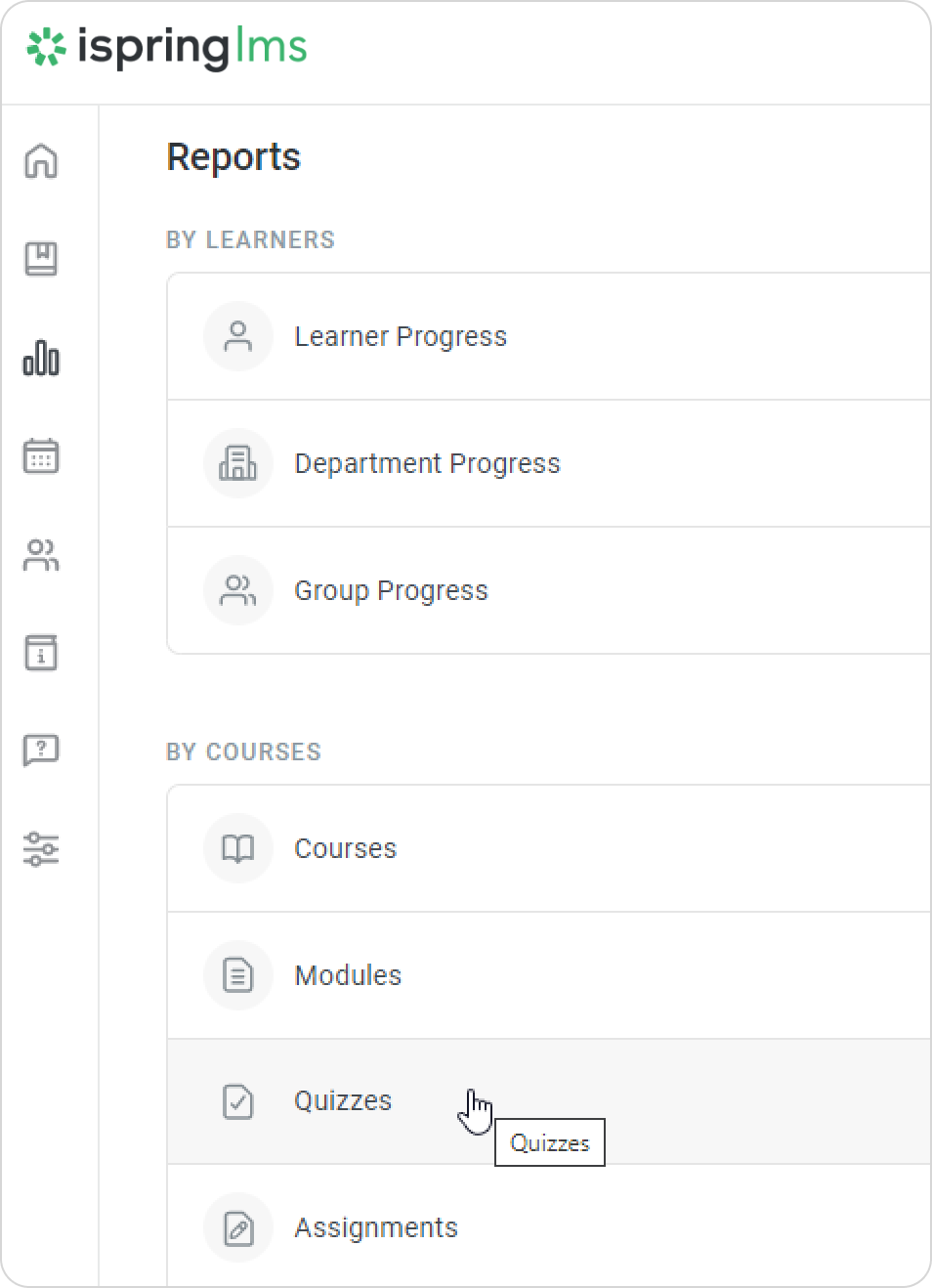 iSpring LMS Reports Report Types Current: Progress Achievement Progress Achievement This kind of report allows you to view how users progress through the modules included in the course: quizzes, role-plays, surveys, and assignments.Open the Reports section and click Quizzes. Select modules and a department/group you would like to run a report on. Then, click Run Report. Once the report is ready, you can either export it to a document or refine parameters by selecting Change report settings. ×