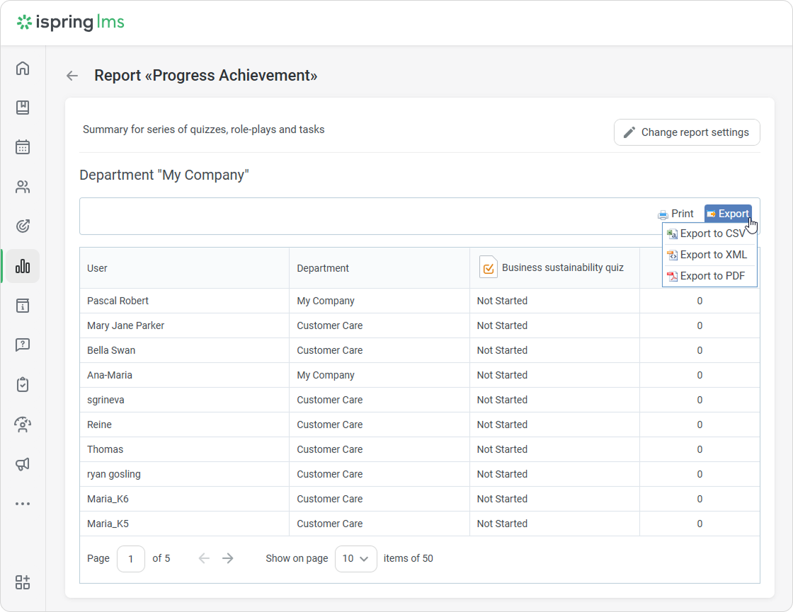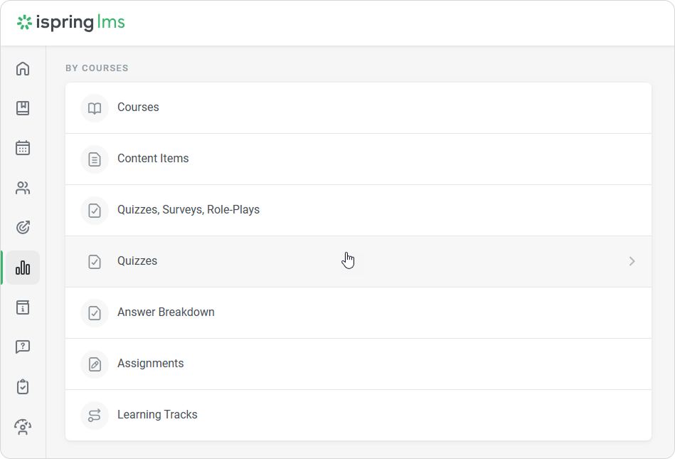 This kind of report allows you to view how users progress through the content items included in the course: quizzes, role-plays, surveys, and assignments.
