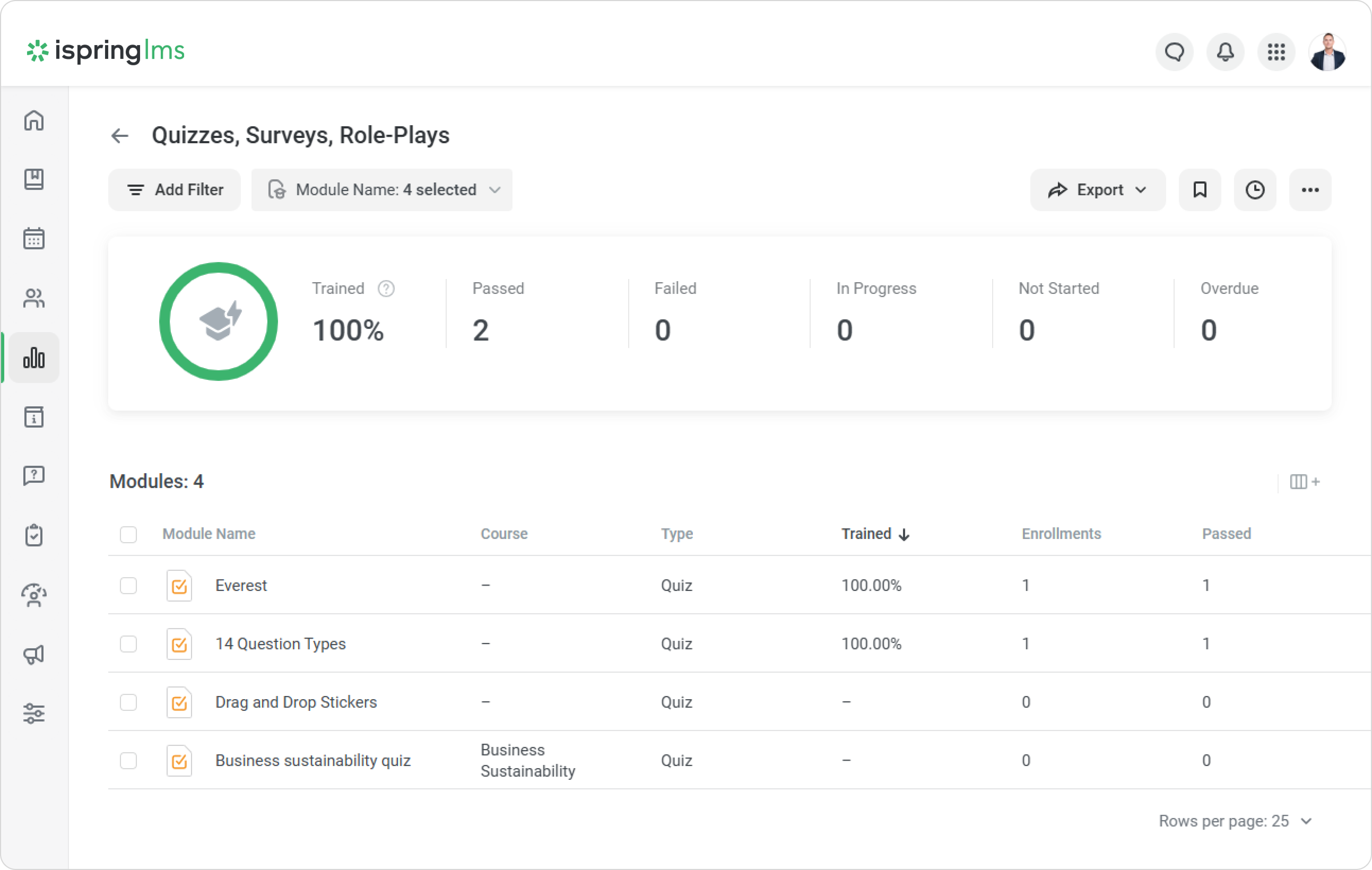 Trained | Level of students' training. To calculate this value, divide the number of completed modules by the total number of assigned modules. |