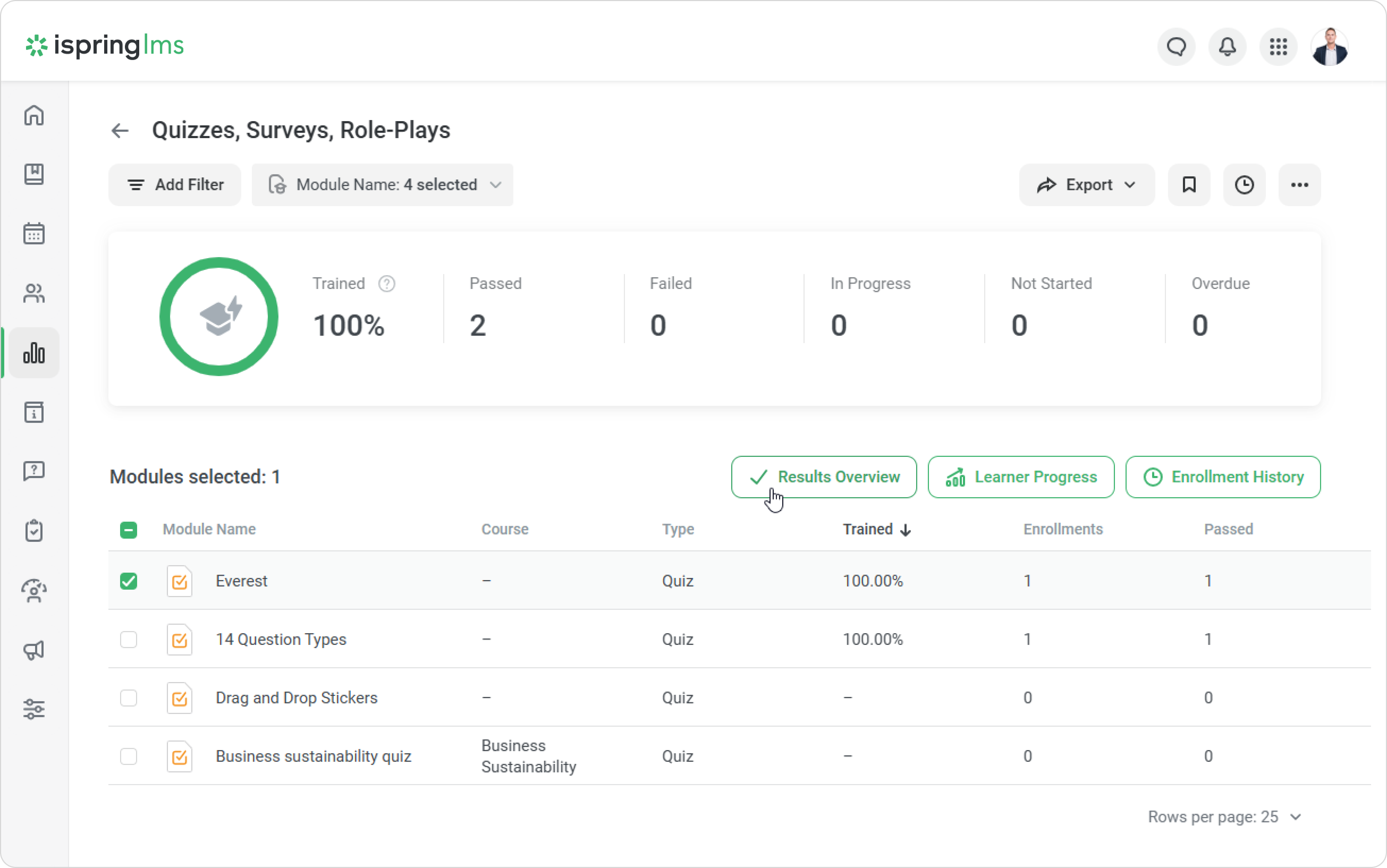 - Select a quiz in the list of modules and click the Results Overview button.