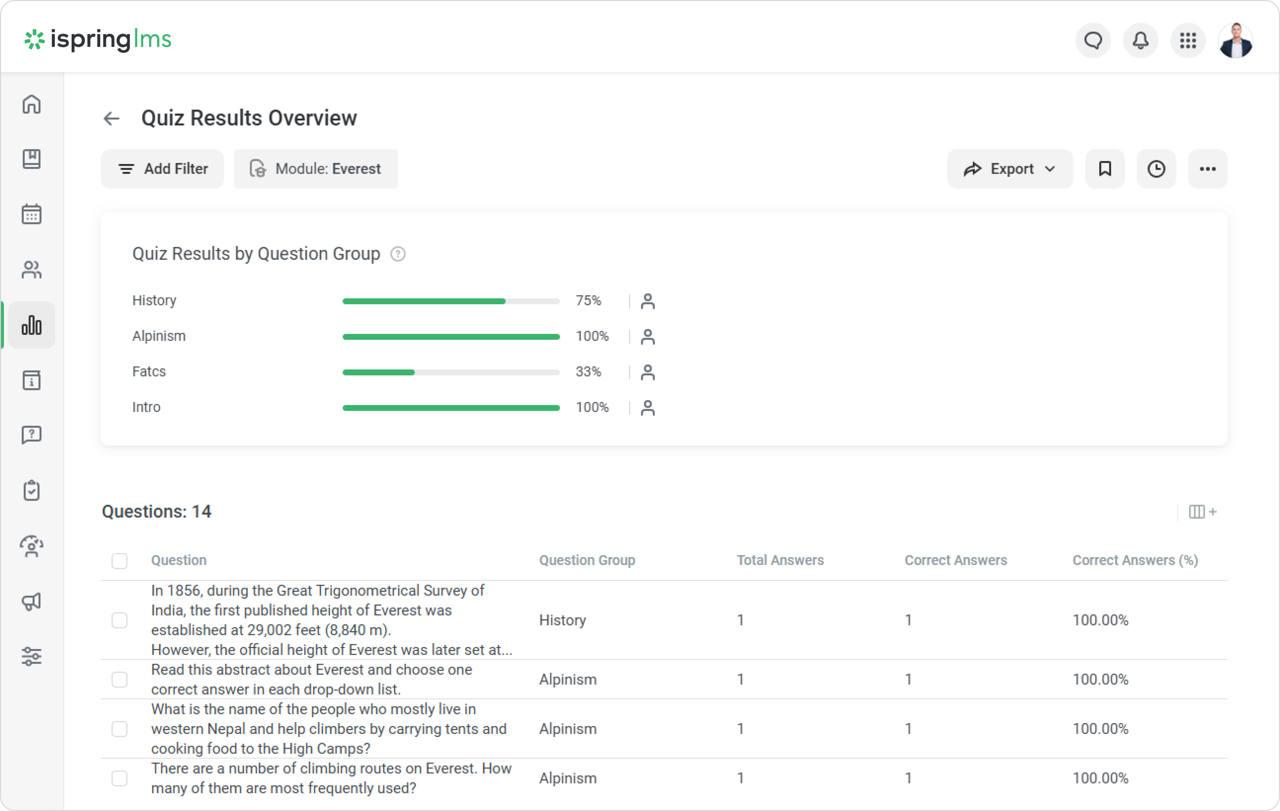 Reports on quizzes, surveys, and role-plays will help identify recurring themes and better organize training. Create a report on content items and go to more detailed statistics for a group of questions in the quiz: