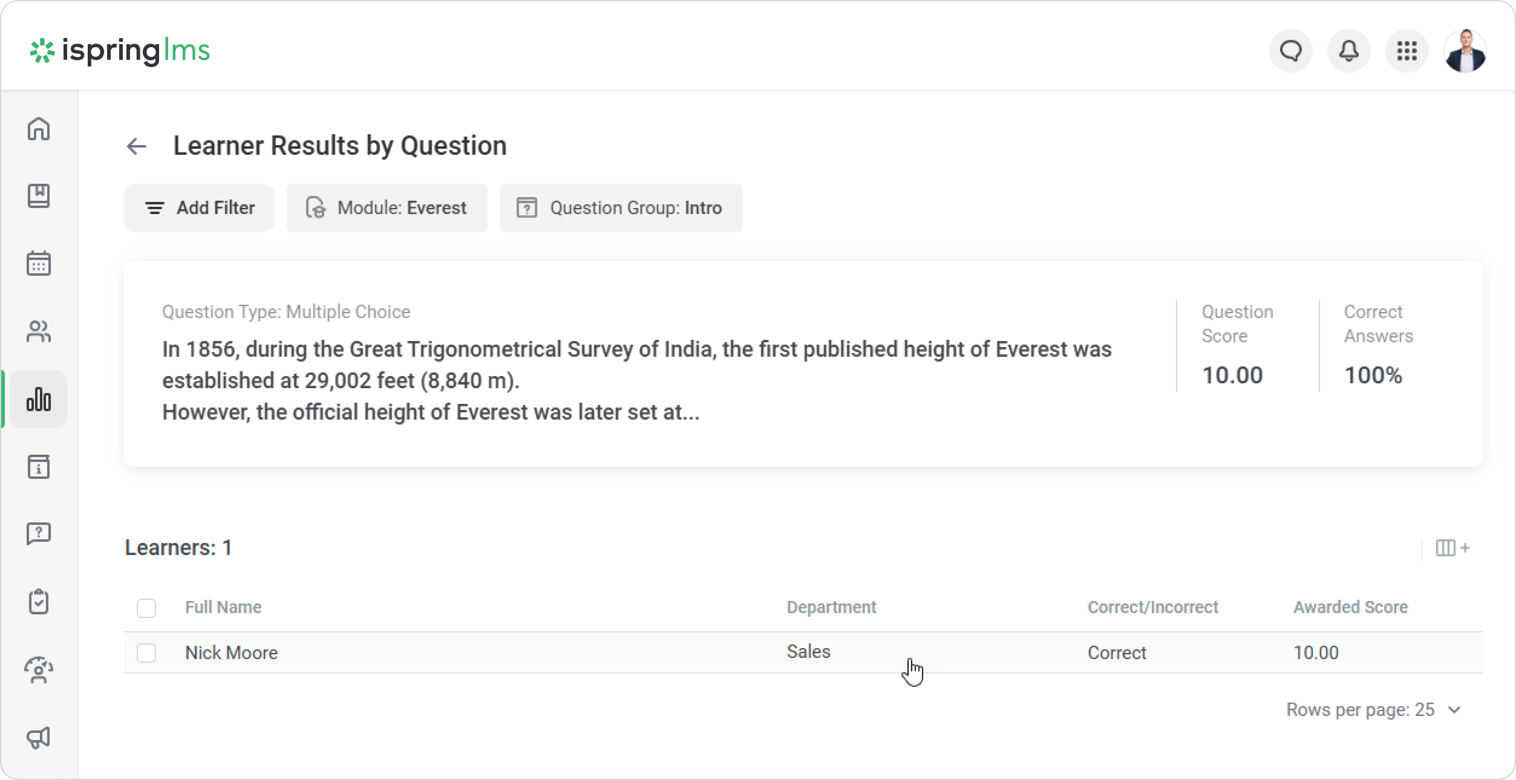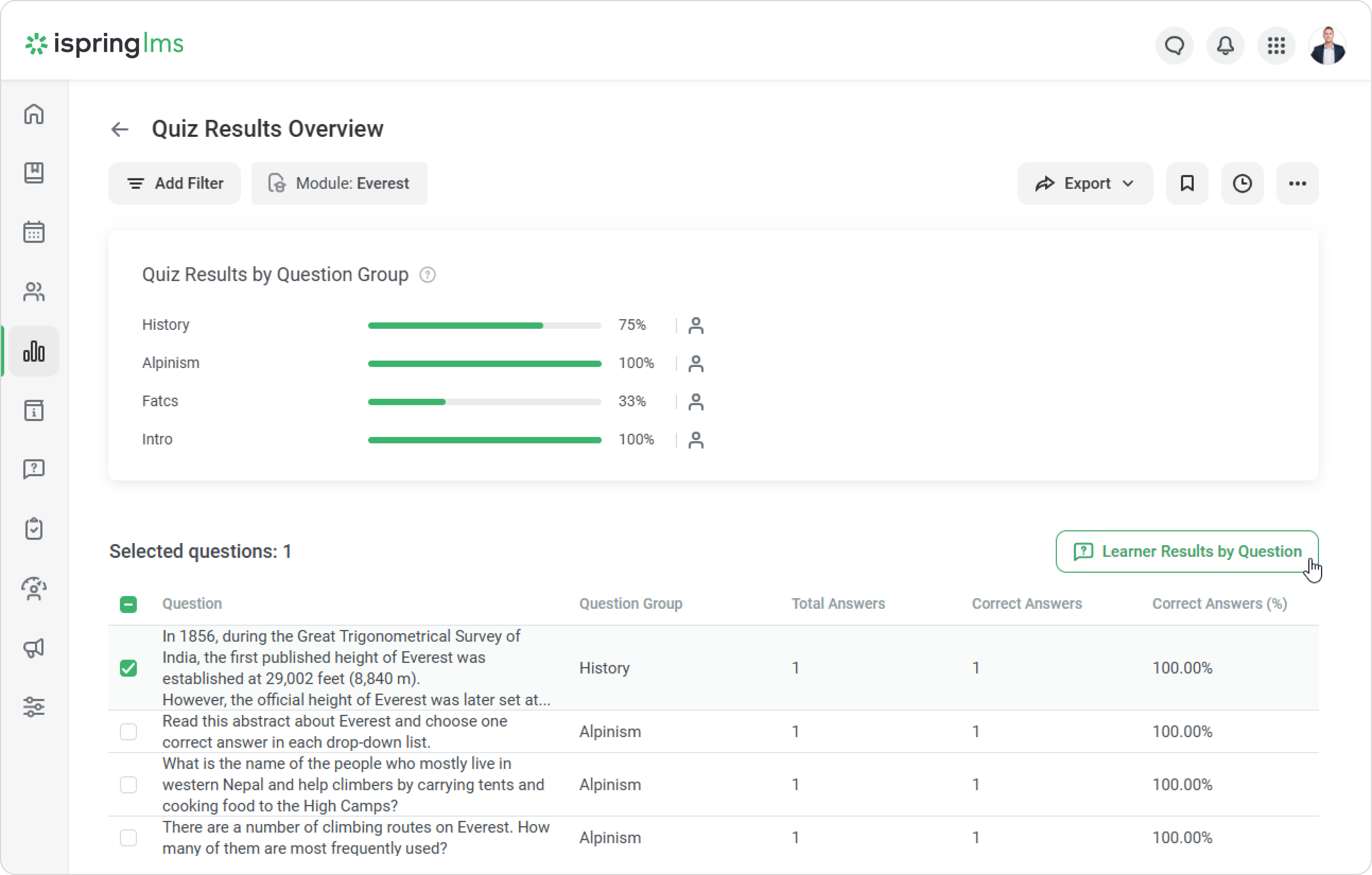- Select a question in the list and click Learner Results by Question.