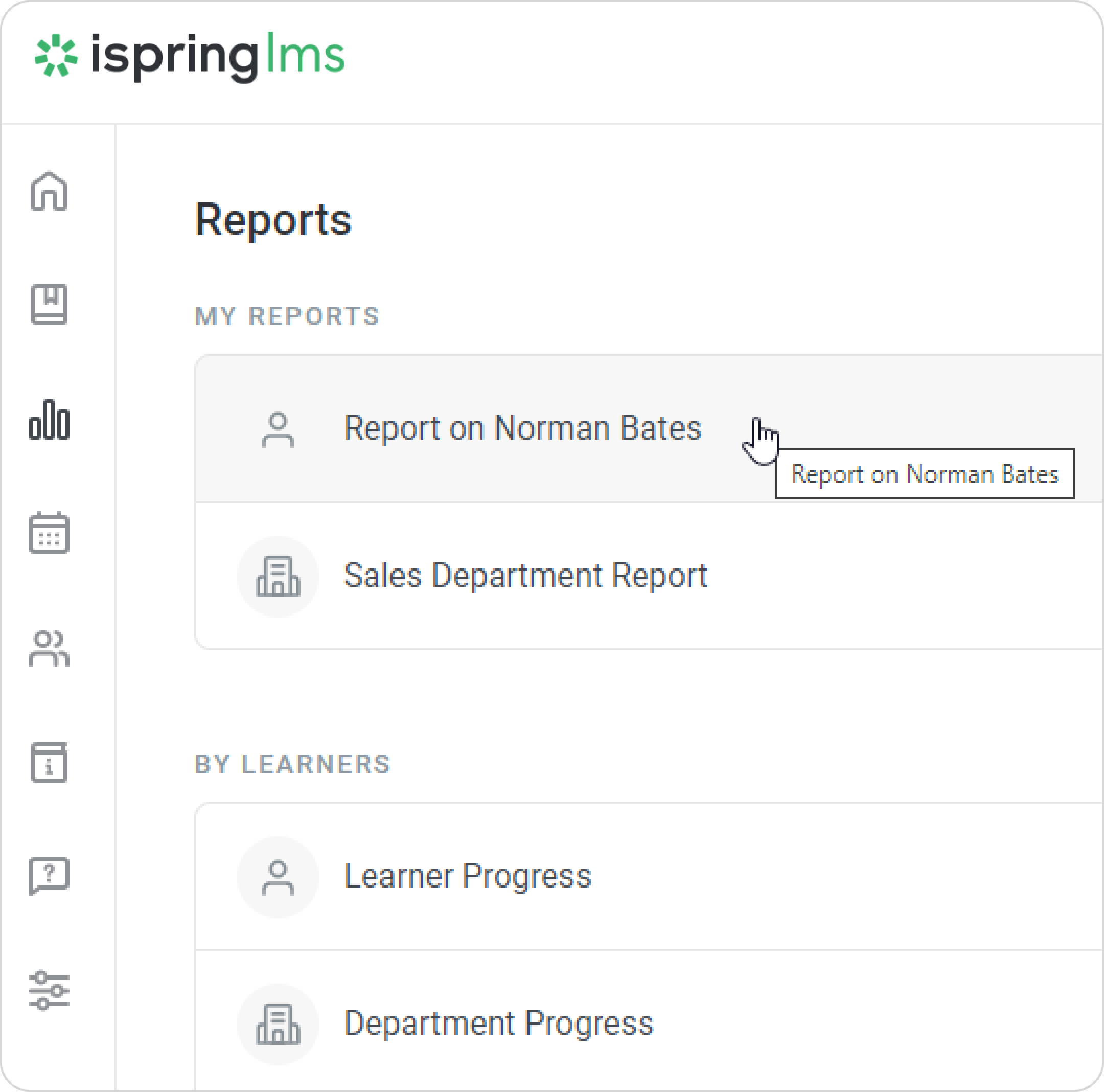 With a saved report template, you can quickly check how a particular user or an entire department advances through courses or find out how many users attended events last month.