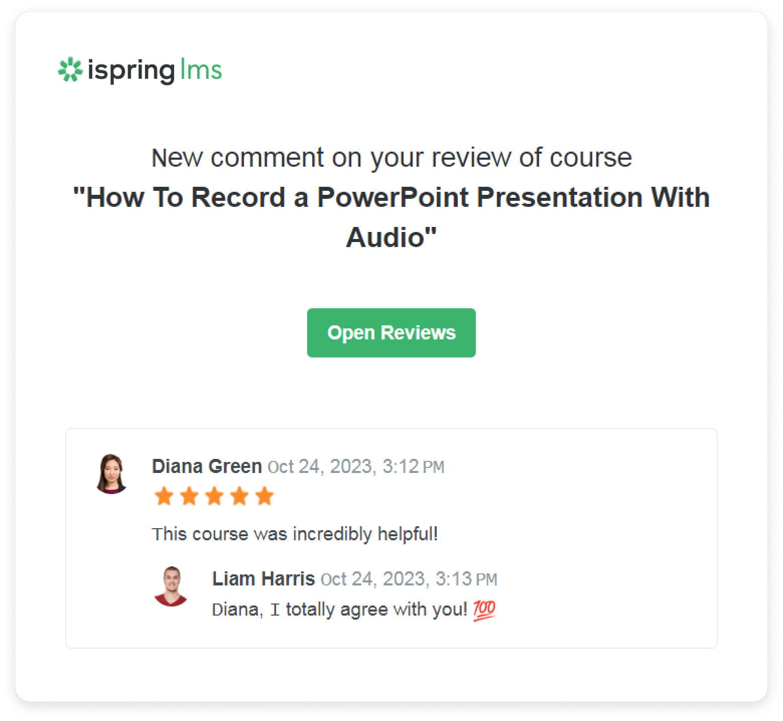 iSpring LMS will notify the learner that their review or comment has been responded to: they will receive an email, a notification in the portal, and a push notification.