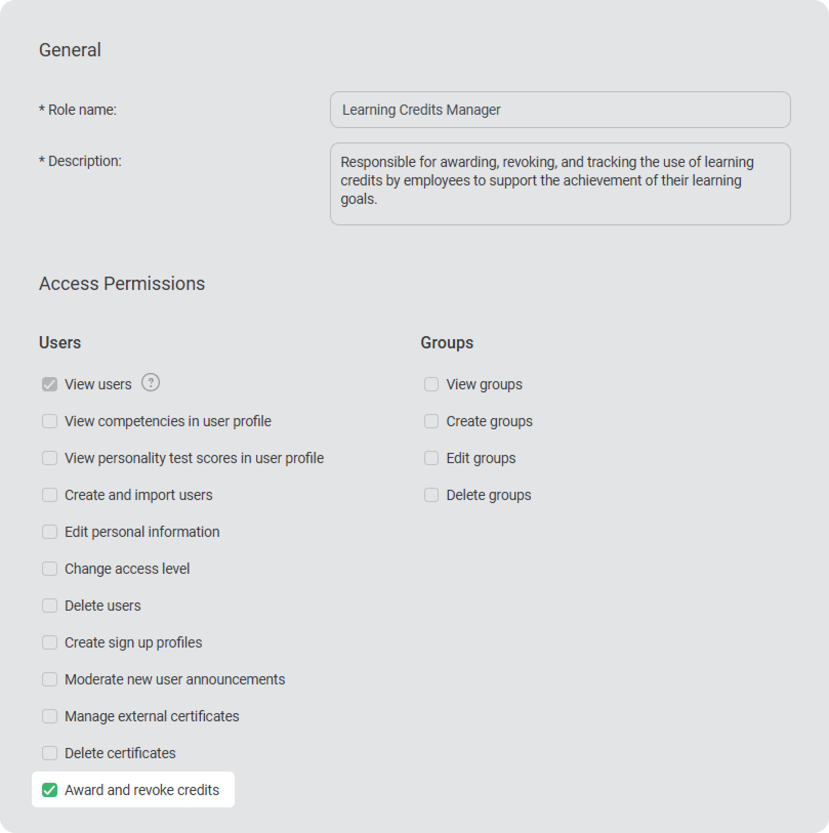 | Set up learning credits to be awarded when a training is completed | + | + | - | - |
