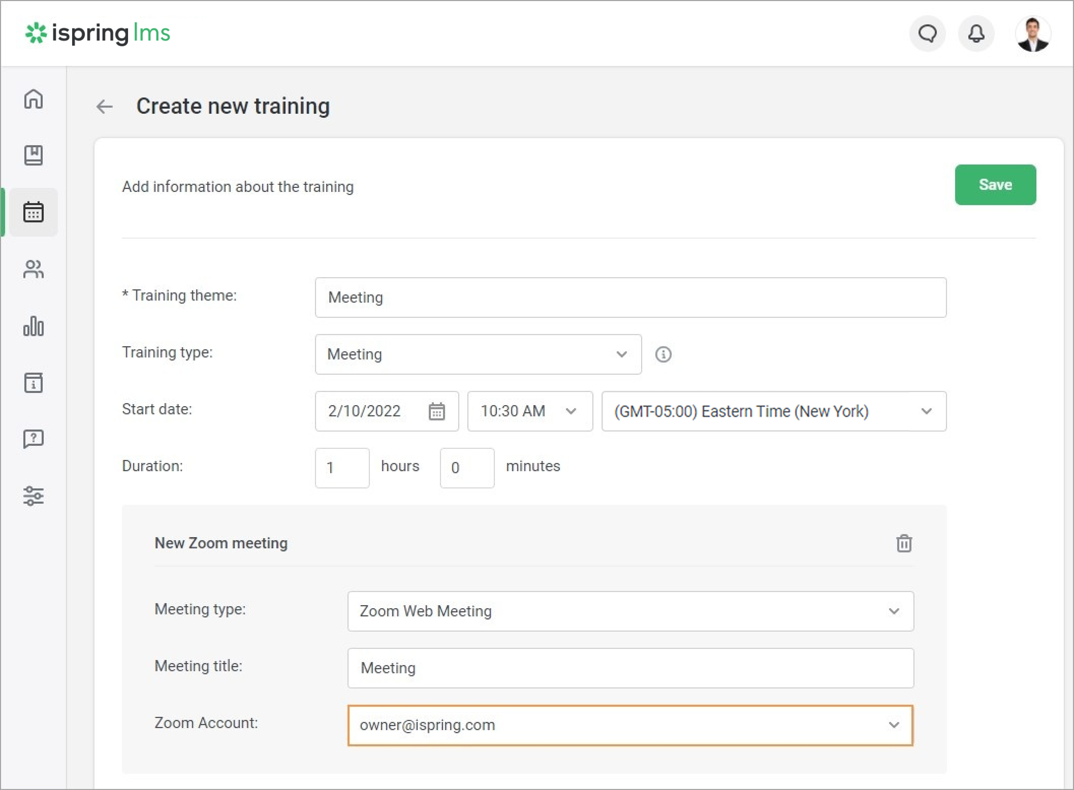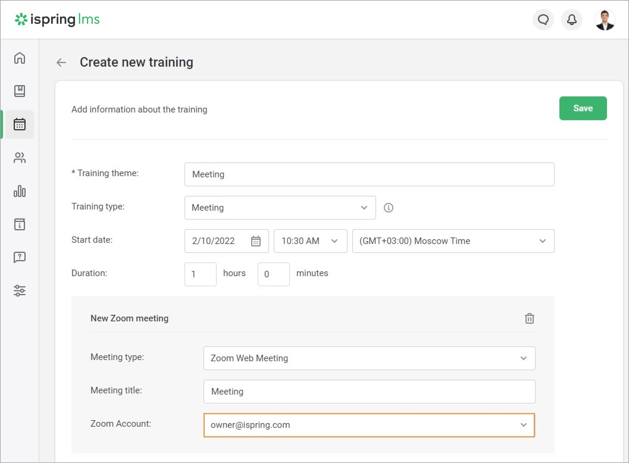 By default, you can schedule zoom meetings in iSpring LMS using only the owner’s Zoom email address.