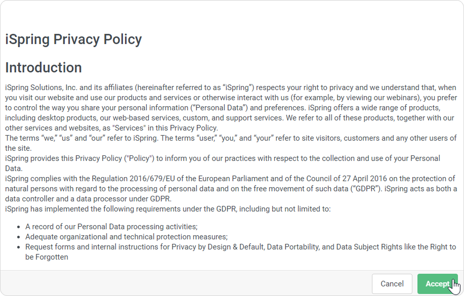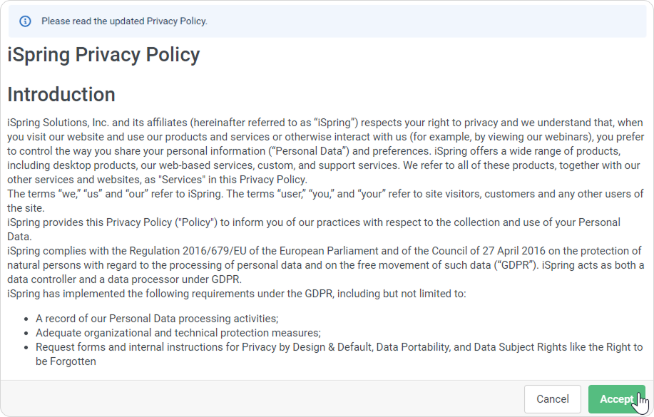 - If you edit the Privacy Policy text, iSpring LMS will notify users. They will need to accept the updated privacy policy again. If users don’t accept the new terms, they will not be able to log in to their account.