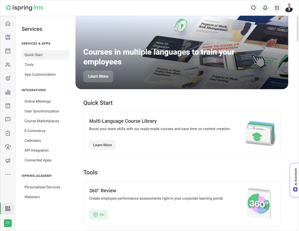 In the Services section, you can find useful courses for employee training, enable integration with services, and book a live demo. Everything you need is in one place.